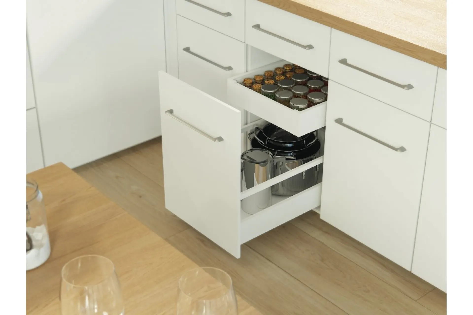 Zásuvka Axis Pro má vysokú odolnosť certifikovanú na 60 000 cyklov. Poskytuje plný výsuv v dĺžkach od 250 do 600 mm a zatvárací mechanizmus zabezpečuje tichú prevádzku a jemné dovieranie zásuvky. Vďaka piatim výškovým variantom sa dokonale prispôsobí vašej kuchyni, pričom bočná strana zásuvky so šírkou iba 14 mm umožňuje maximálne využitie vnútorného priestoru nábytku. Zásuvka unesie až 40 kg rôznych výrobkov a ponúka možnosť vnútorného výsuvu. Inštalácia je jednoduchá vďaka pohodlnému nastaveniu zvnútra, možnosti nastavenia náklonu a horizontálneho nastavenia v rozsahu ±2 mm. Zásuvka je kompatibilná s rôznymi systémami organizácie priestoru, príborovými vložkami, protišmykovými rohožami a triedičmi odpadu.