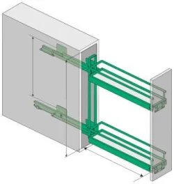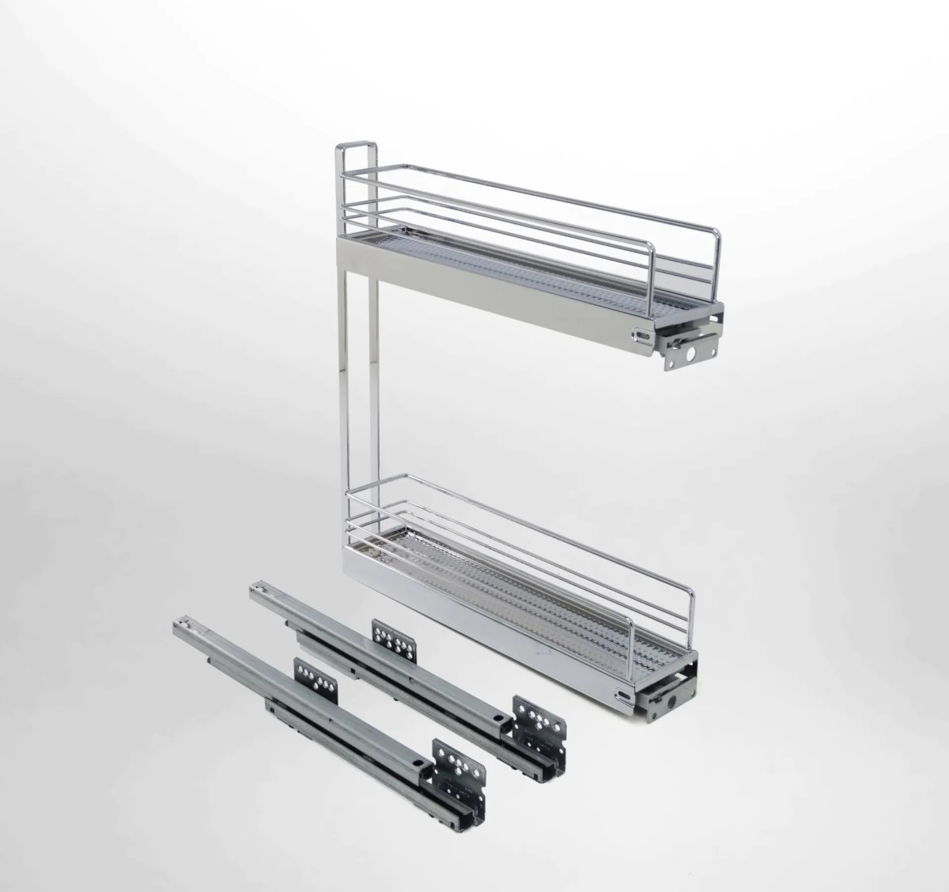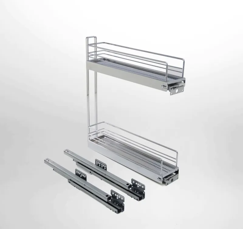 Celovýsuvný dvojitý kôš pre šírku korpusu 150mm. Plnovýsuv s tlmením, nosnosť 15 kg. 3D – nastavenie bez náradia. Fixné police, montáž na pravý bok korpusu.