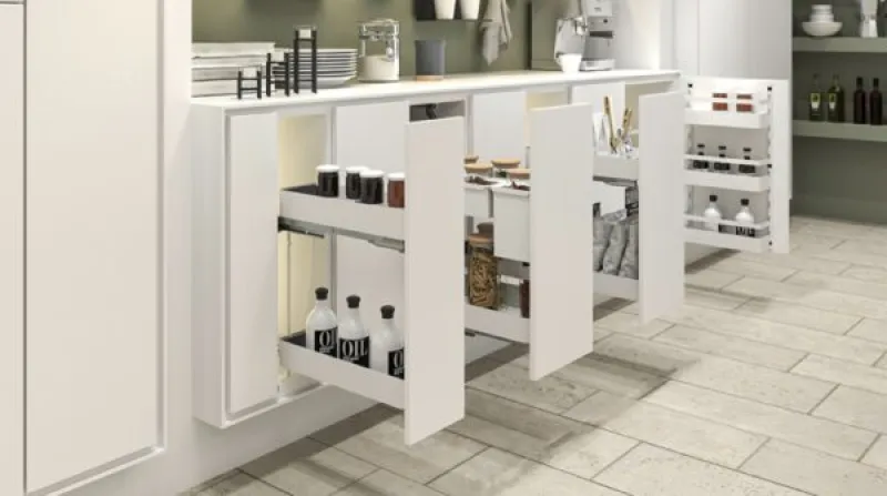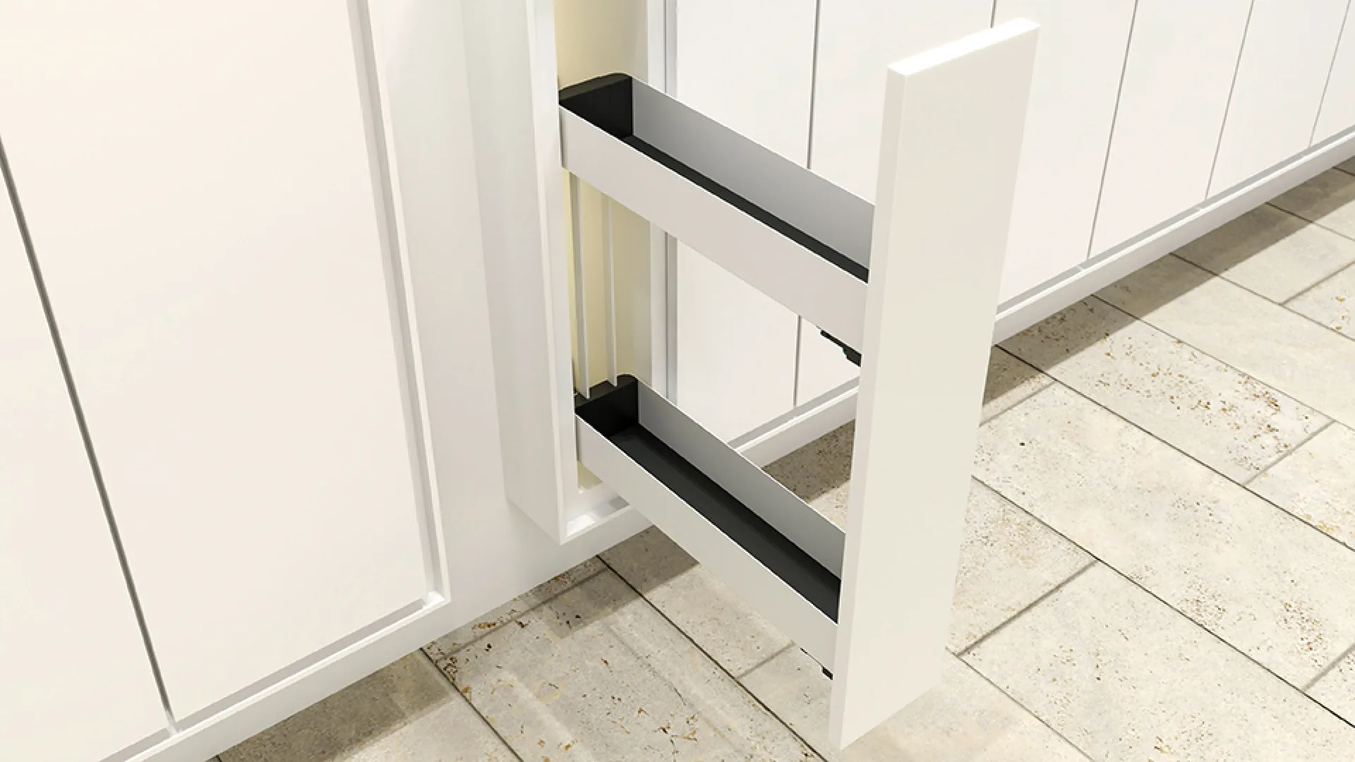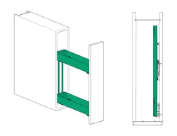 Celovýsuvný dvojpolicový kôš pre šírku korpusu 150 mm. Plnovýsuv s tlmením, nosnosť 12 kg. 3D - nastavenie bez náradia, fixné police, montáž na pravý bok korpusu.