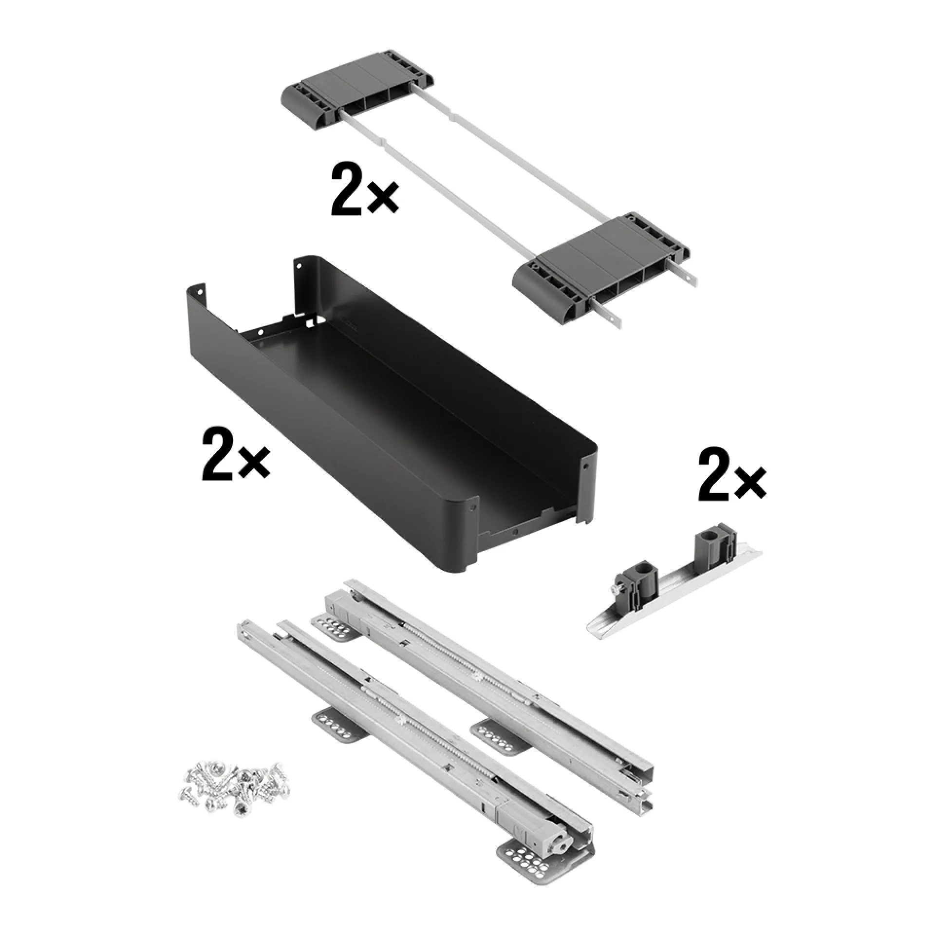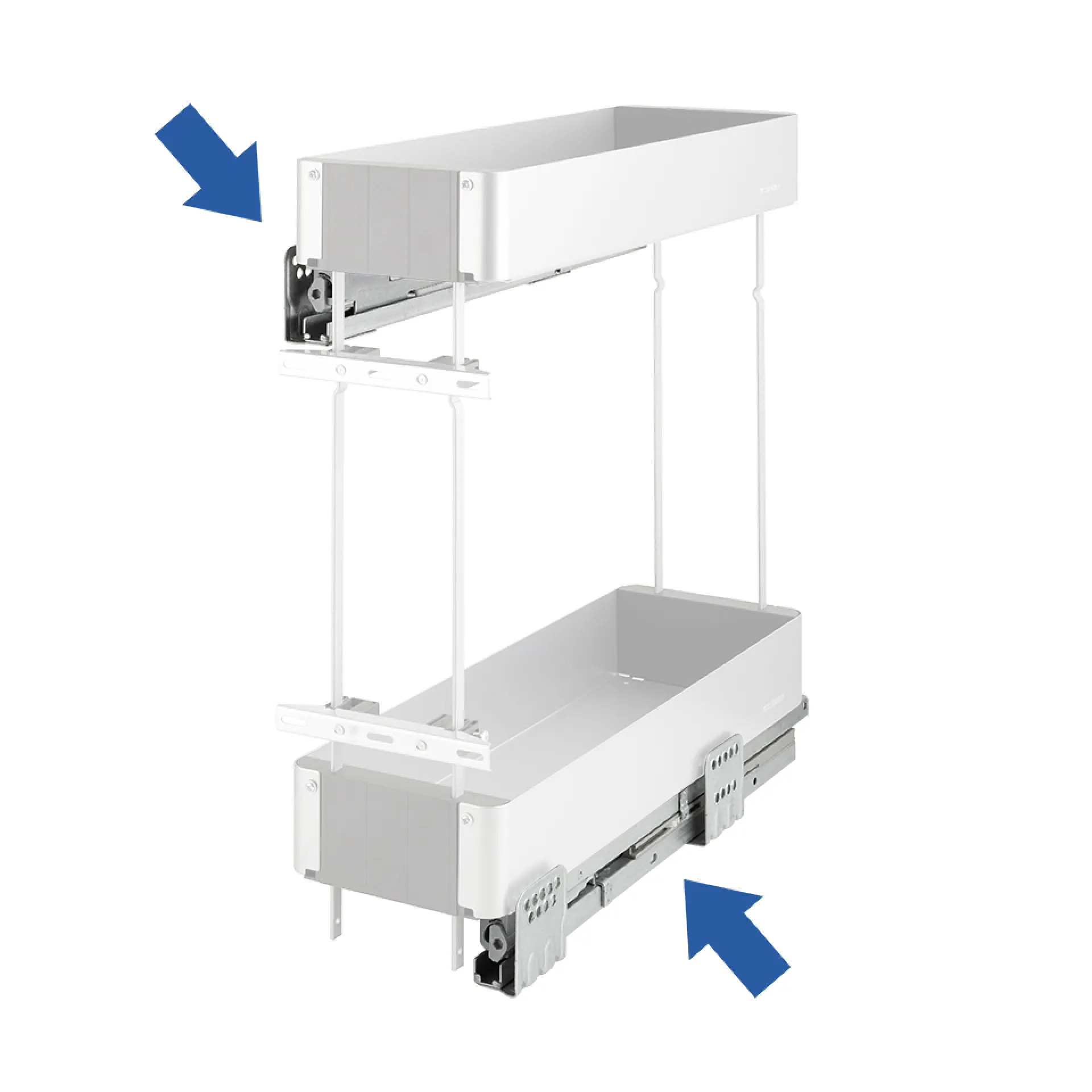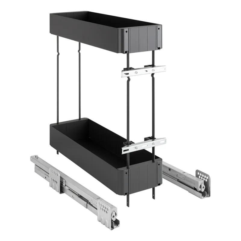 Celovýsuvný dvojpolicový kôš pre šírku korpusu 200 mm. Plnovýsuv s tlmením, nosnosť 28 kg. Fixné police, obojstranná montáž výsuvu.