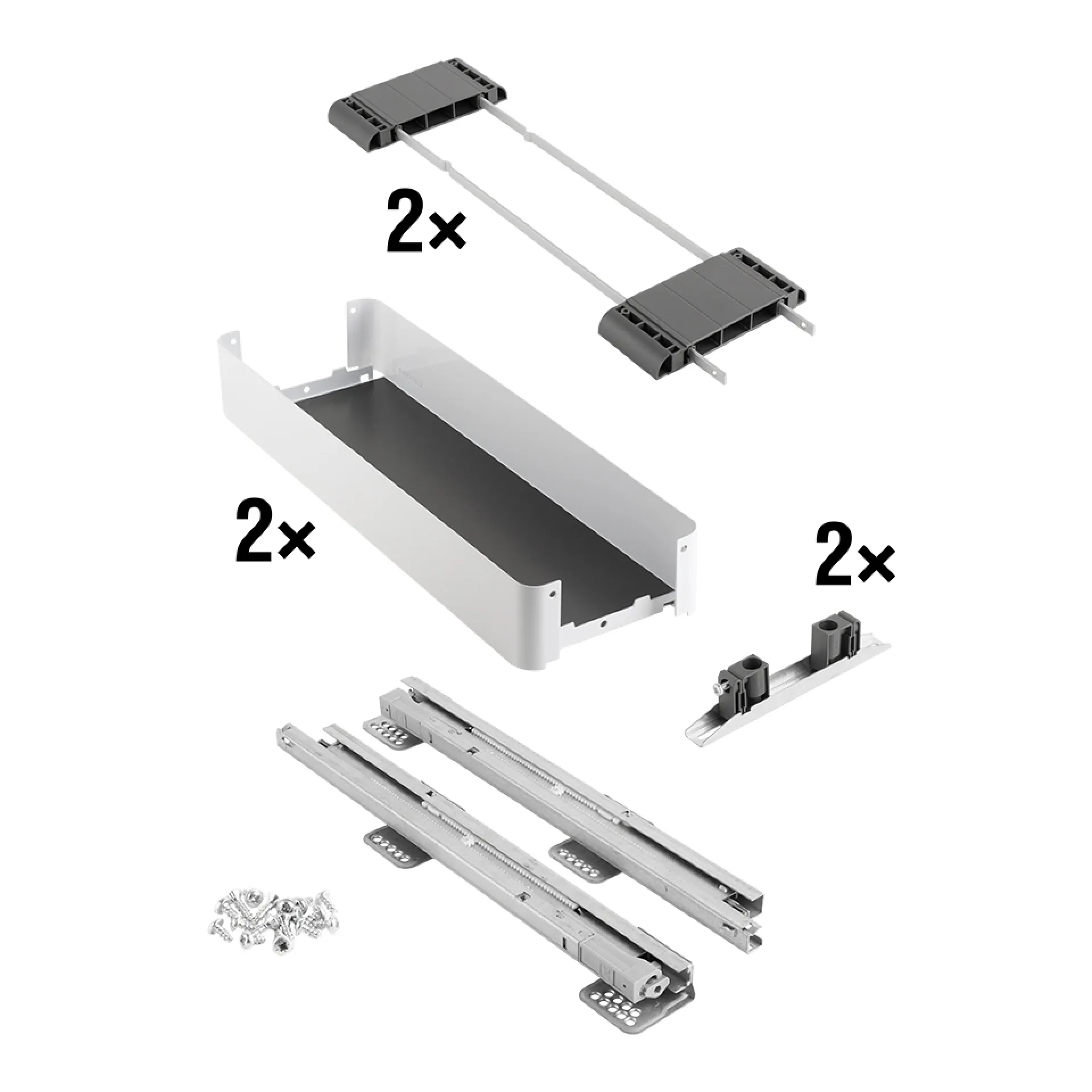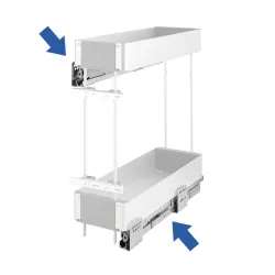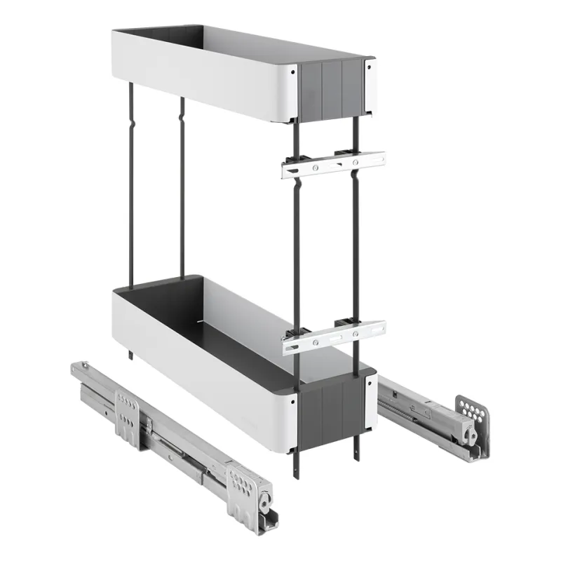 Celovýsuvný dvojpolicový kôš pre šírku korpusu 200mm. Plnovýsuv s tlmením, nosnosť 28 kg. Fixné police, obojstranná montáž výsuvu.