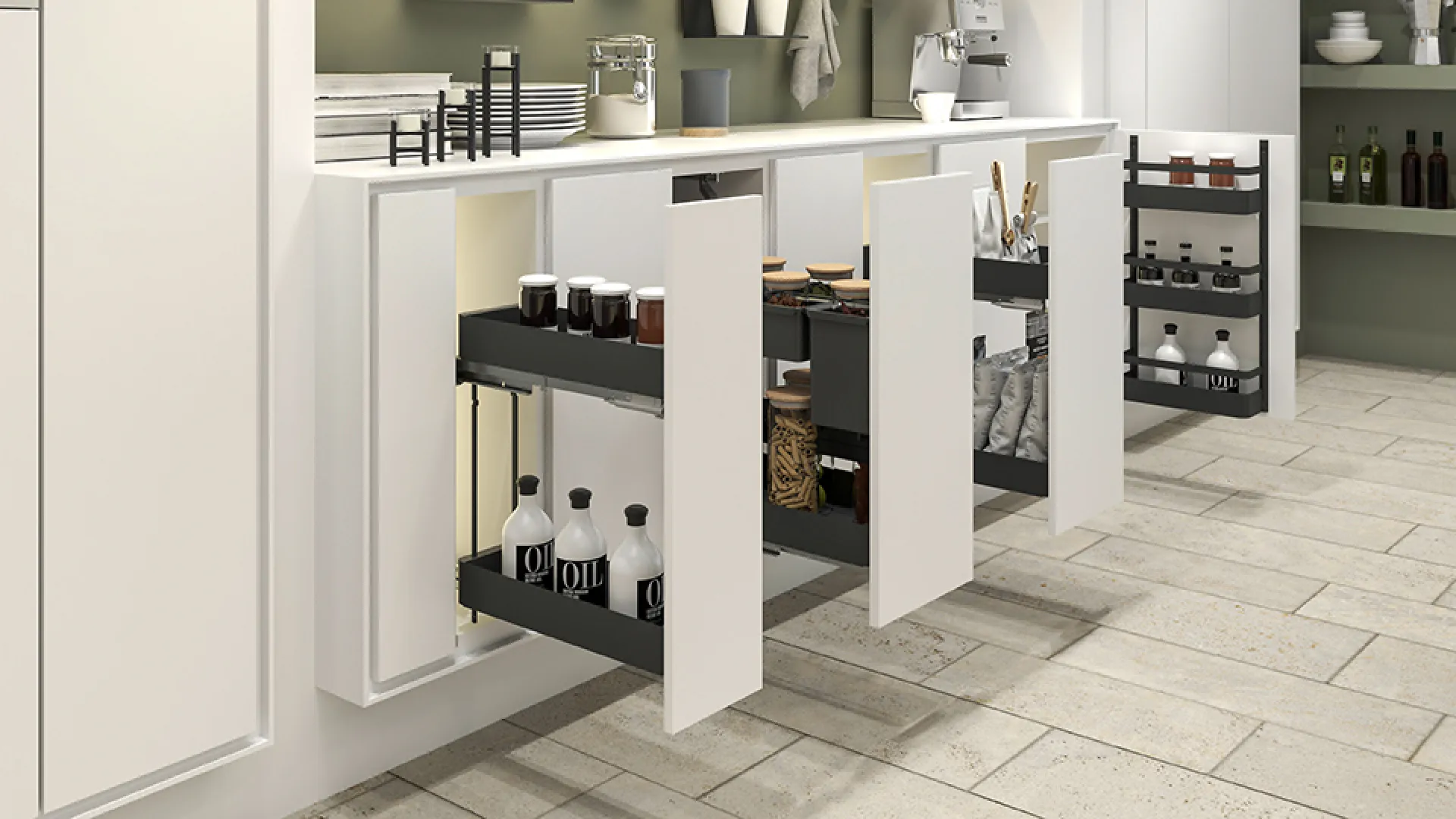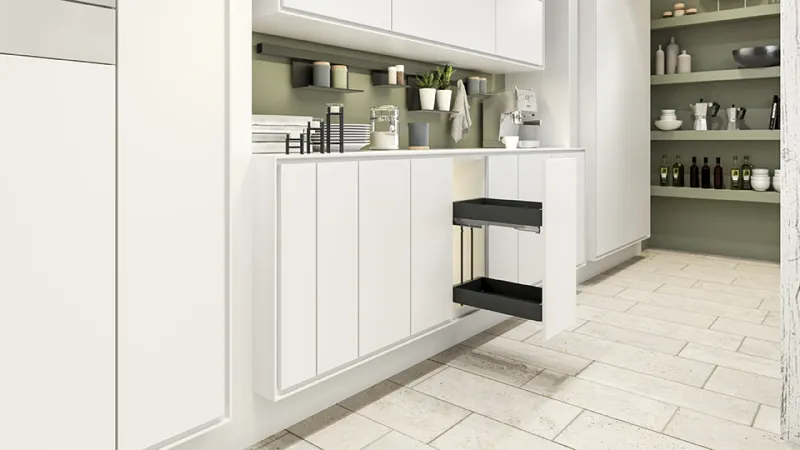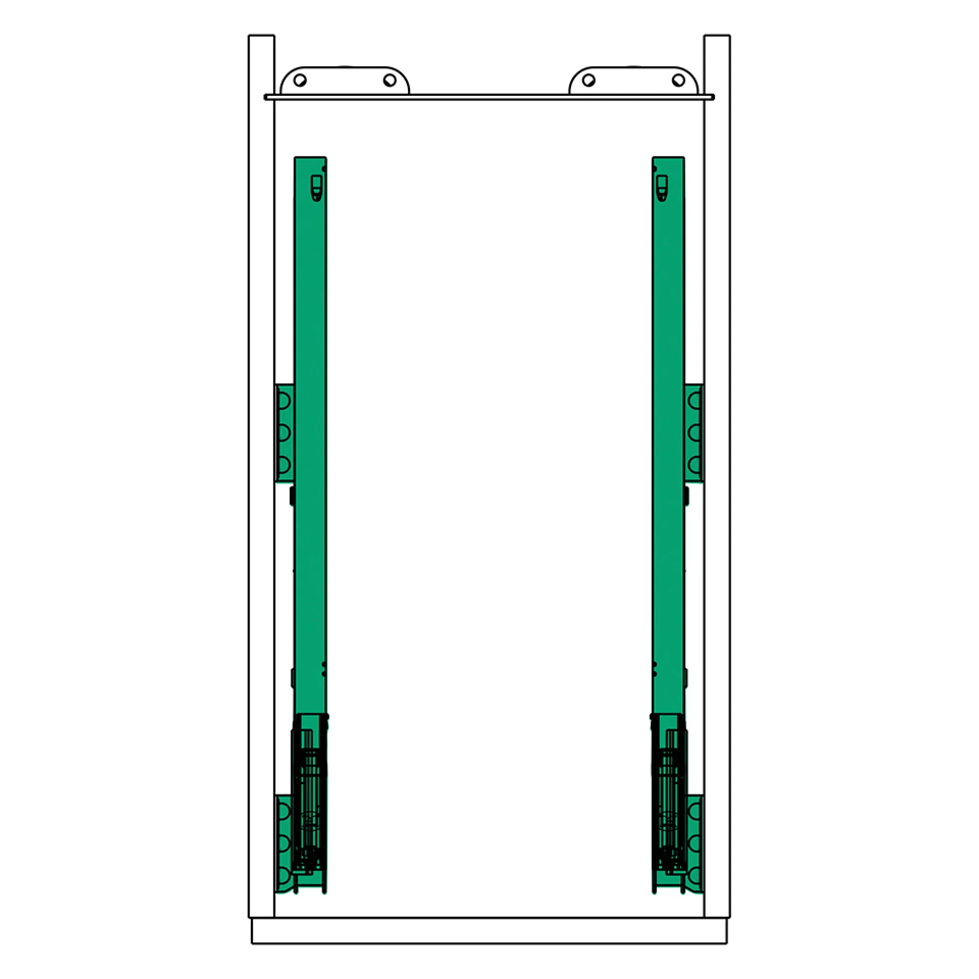 Celovýsuvný dvojpolicový kôš pre šírku korpusu 400 mm. Plnovýsuv s tlmením, nosnosť 28 kg. Fixné police, obojstranná montáž výsuvu.
