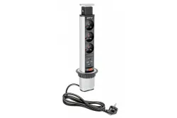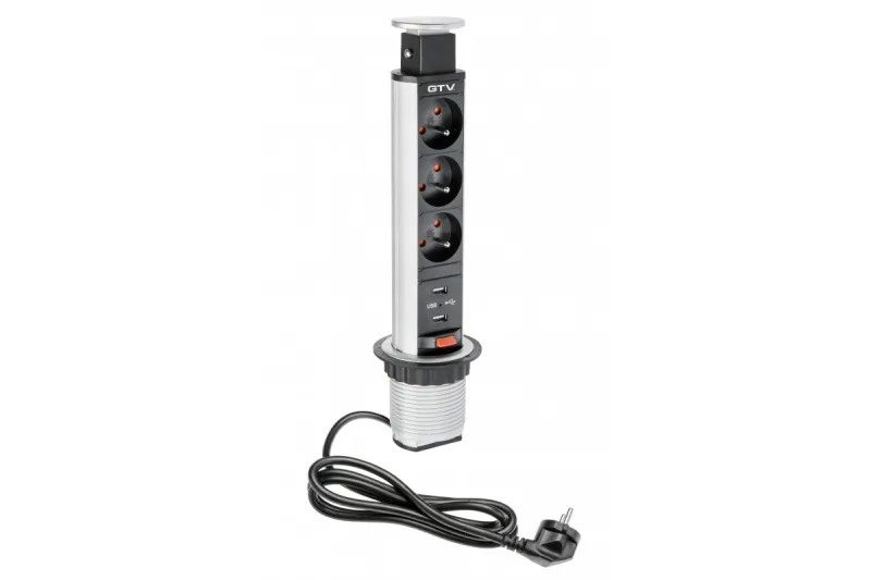 Vysúvné zásuvky patria medzi najobľúbenejšie riešenia na trhu. Sú vhodné do úzkych priestorov – malé stoly alebo kuchynské pracovné dosky. Zásuvka obsahuje tri zásuvky 230V a dva porty USB na nabíjanie mobilných zariadení. Ukončené štýlovým krytom. Montážny otvor priemer 60 mm. Dĺžka kábla 1,5 m.