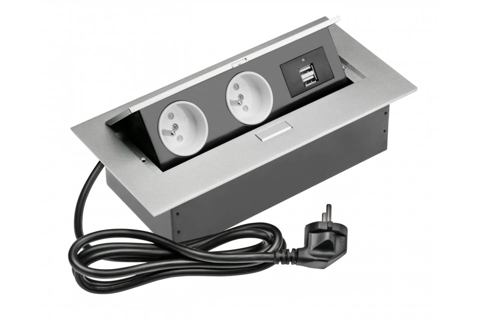 Zapustená výklopná zásuvka je skvelým riešením pre minimalistov a všetkých ľudí, ktorí oceňujú jednoduchosť. Neviditeľne splýva s povrchom akéhokoľvek stola alebo dosky. Je k dispozícii v troch farbách: biela, čierna a strieborná. Produkt je dodávaný s 3 elektrickými zásuvkami 230V alebo 2 zásuvkami 230V a 2 portami USB-A. Dĺžka kábla 1,5 m.