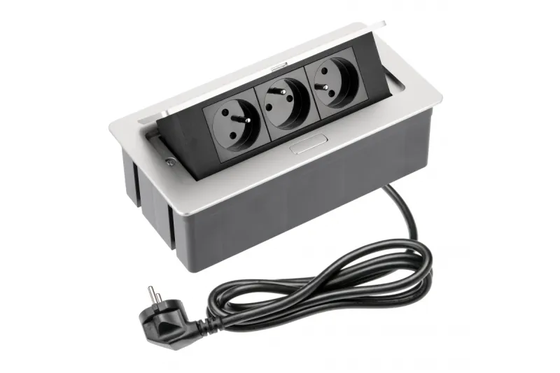 Zapustená výklopná zásuvka s novým kompaktným dizajnom. Disponuje naklonenými zásuvkami, takže nedochádza ku kolízii káblov. Všestranné využitie umožňuje jednoduchú inštaláciu napr. na stolovú dosku, kuchynskú dosku alebo pracovný stôl. Saténová povrchová úprava jej dodáva eleganciu a je príjemná na dotyk. Zariadenie zvládne zaťaženie až 3600W. Výrobok je dodávaný s napájacím káblom s dĺžkou 1,5 metra. Dostupný v troch farbách: biela, čierna a strieborná.