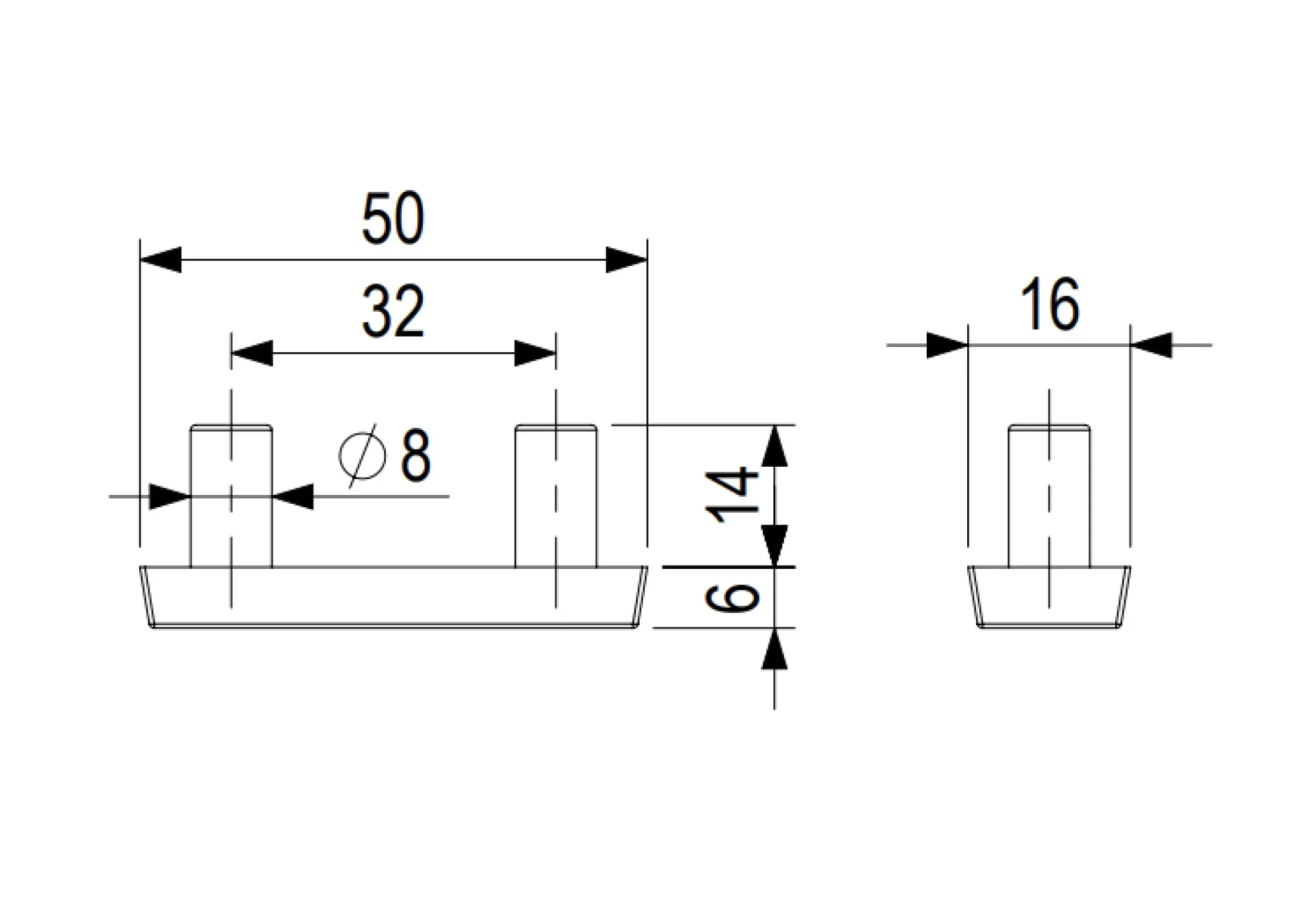 Narážací klzák s rozostupom 32 mm. Dĺžka kolíka 14 mm s priemerom 8 mm. Výška klzáku 6 mm.