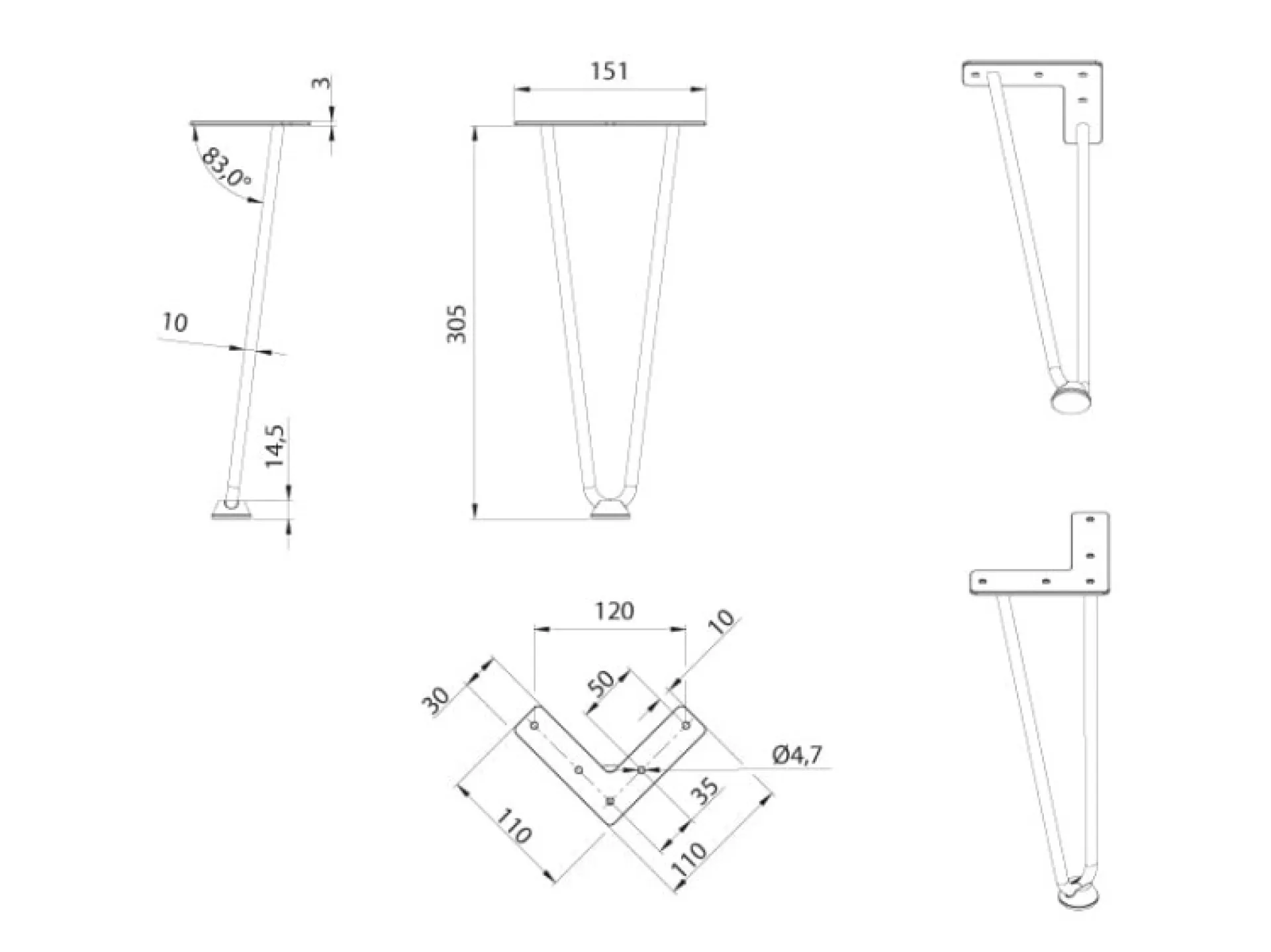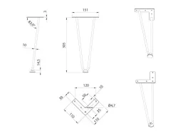 Oceľová šikmá stolová noha DN-802 H-305 v čiernom matnom prevedení s podložkou proti poškriabaniu podlahy