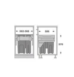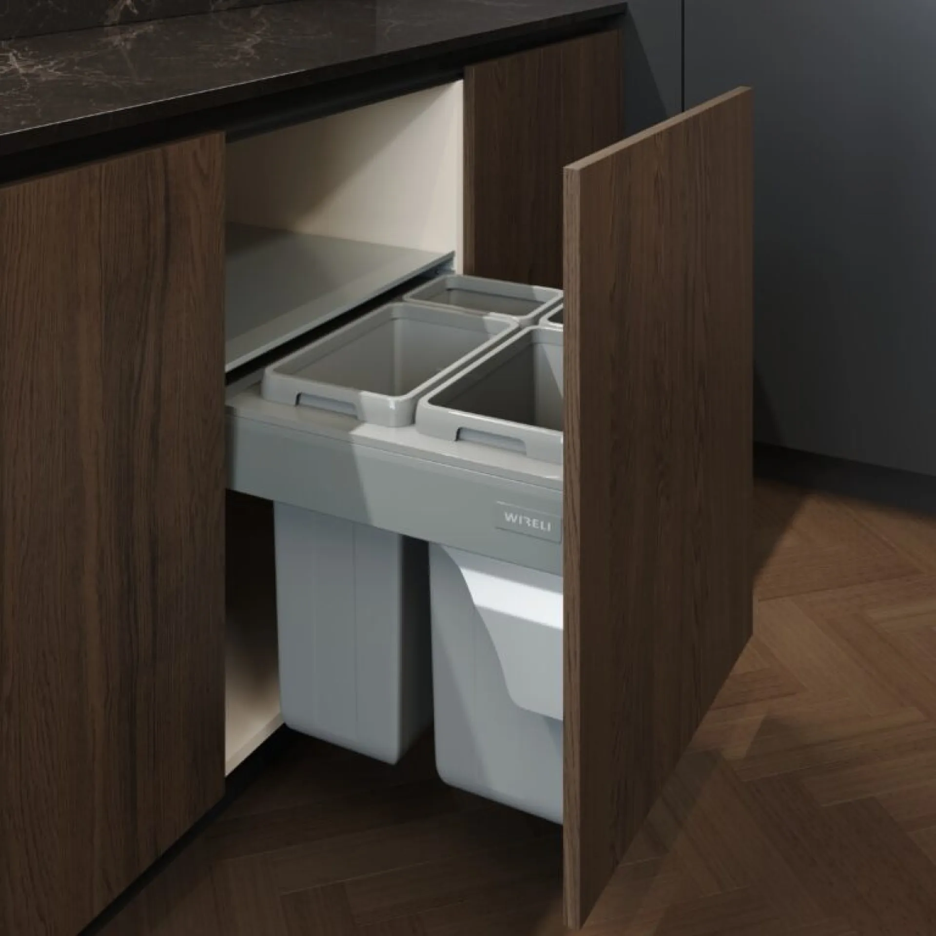 Systém má dve 27-litrové a dve 9-litrové nádoby a je vybavený pevným oceľovým vekom, ktoré okrem zakrytia košov slúži aj ako polica vo vnútri korpusu na uloženie ľahkého príslušenstva.