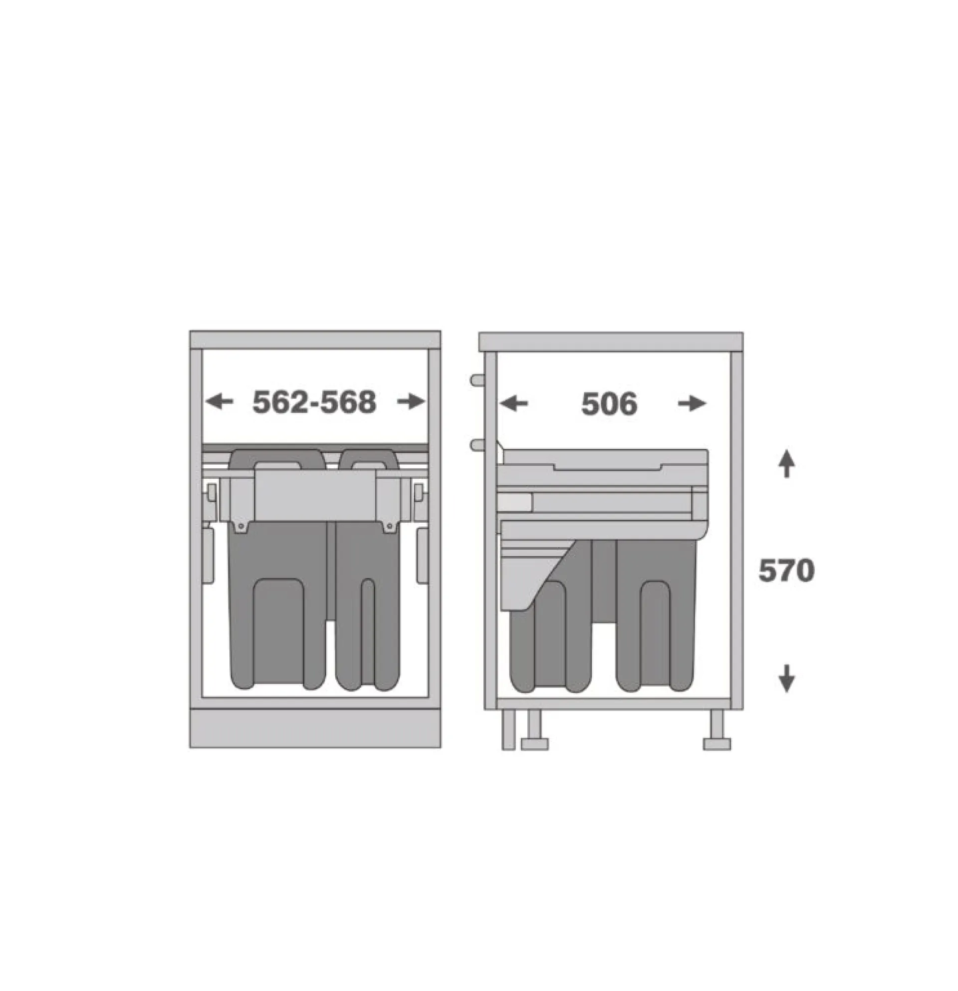 Po inštalácii do korpusu a po vysunutí sú nádoby koša plne vyberateľné. Kvalitný plastový rám dodáva systému vysokú odolnosť a výsuv umožňuje úplné vysunutie aj hladké zatvorenie systému.