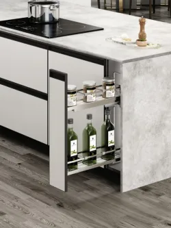 Koše s plným dnom sú vybavené protišmykovým povrchom, ktorý zabraňuje posunu fliaš, pohárov alebo koreničiek počas manipulácie. Každý kôš je navyše doplnený chrómovaným relingom v tvare pásoviny, ktorý zabezpečuje bezpečné uloženie obsahu a zároveň podčiarkuje elegantný vzhľad celého systému.