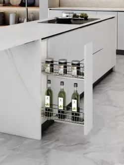 Tento typ vyhotovenia umožňuje jednoduché a prehľadné uloženie fliaš, koreničiek či iných kuchynských doplnkov a zabezpečuje komfortný prístup pri každodennom používaní. Výsuvy s tlmeným dovieraním garantujú tichý a plynulý chod a prispievajú k dlhej životnosti nábytku.