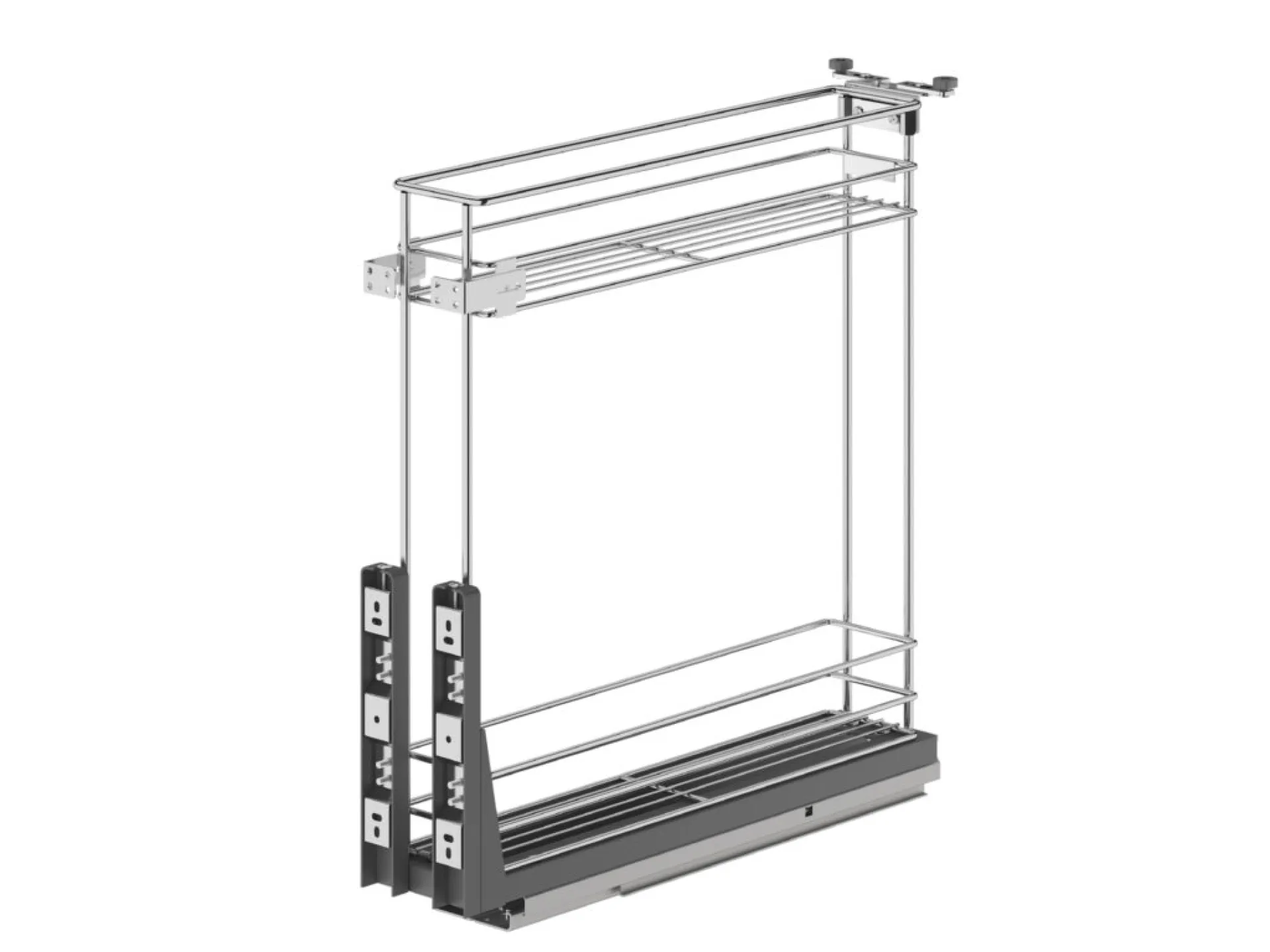 Stabilizácia výsuvu je zabezpečená pomocou dilatačných vodiacich koliesok umiestnených v zadnej časti koša. Tieto technické riešenia prispievajú k plynulému chodu, vysokej stabilite a dlhodobej spoľahlivosti pri každodennom používaní. Tento typ vyhotovenia umožňuje jednoduché a prehľadné uloženie fliaš, koreničiek či iných kuchynských doplnkov a zabezpečuje komfortný prístup.