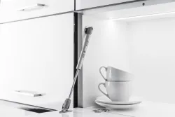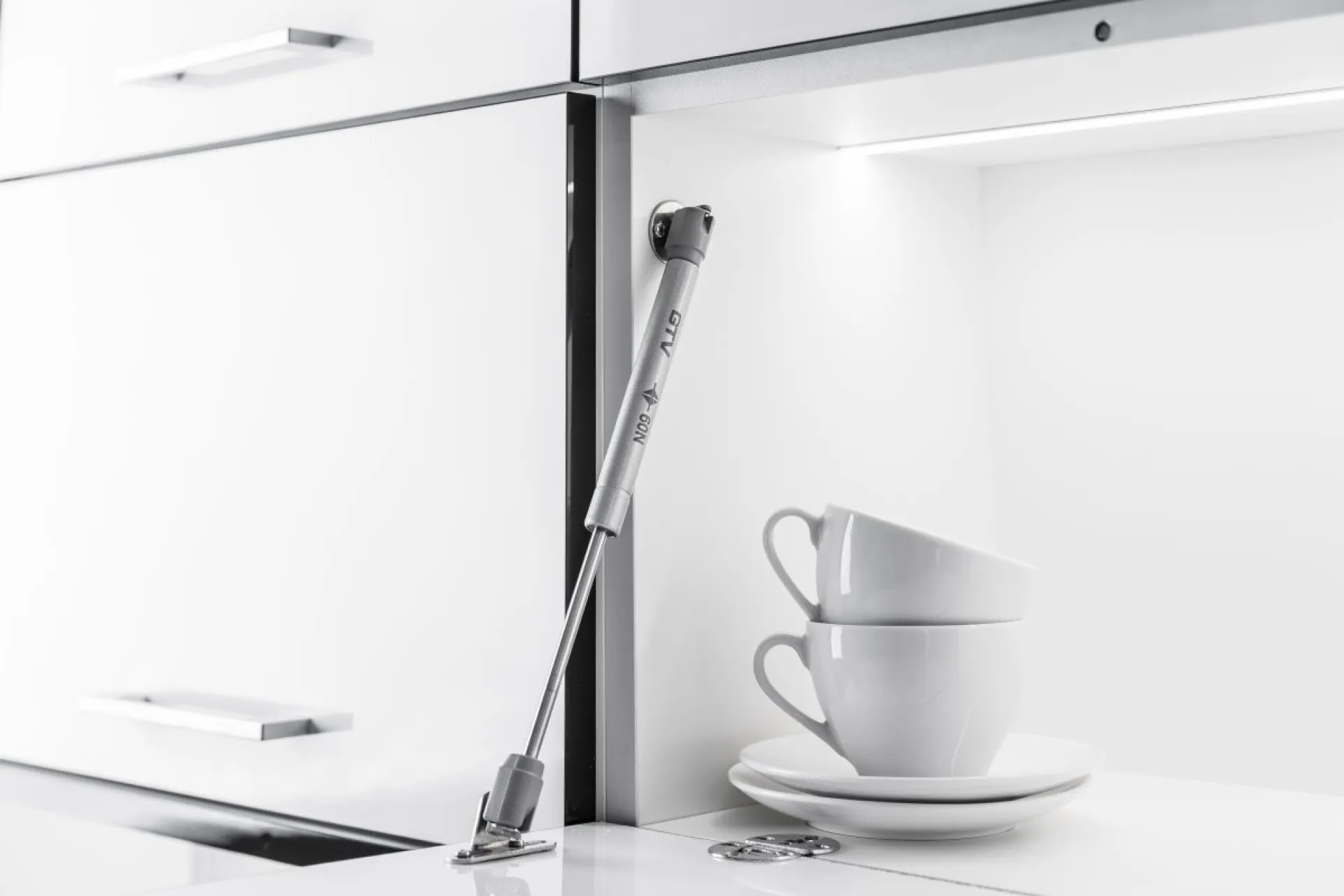 Plynový piest tlmí otváranie sklopných dvierok. Približný uhol otvorenia je 90° v závislosti od použitého pántu. Môže byť použitý ako pre drevené dvierka, tak aj pre dvierka z hliníkových profilov. Počas montáže vyžaduje použitie pántov.