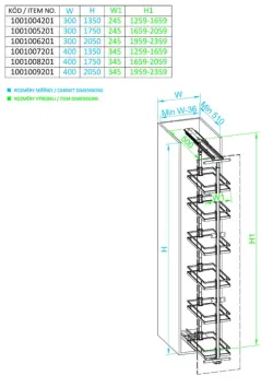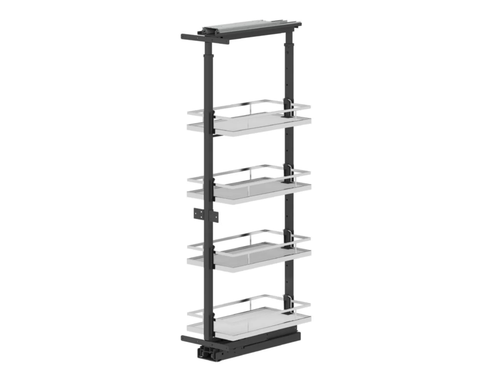 Plnovýsuvná potravinová skriňa WIRELI Elegance so 4 košmi s plným dnom, protišmykovým povrchom a chrómovaným relingom predstavuje moderný a technicky vyspelý úložný systém navrhnutý pre skrinky so šírkou 300 mm. Je ideálnym riešením pre kuchyne, ktoré kladú dôraz na praktickosť, tichý chod a elegantný dizajn.