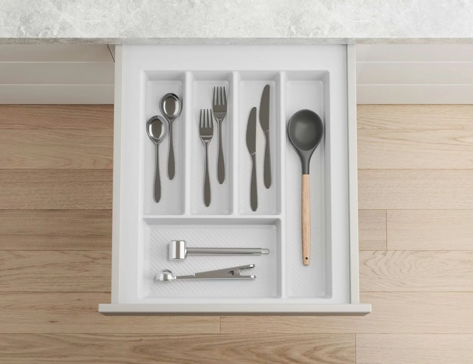 Príborníky STAR sú vyrobené z odolného plastu s jemnou štruktúrou, čo z nich robí elegantný doplnok vašej kuchyne. Vďaka dostatočne širokým okrajom pohodlne vyplníte každú zásuvku. Stačí si zmerať vnútorný rozmer zásuvky a okraje odrezať podľa vašich preferencií.