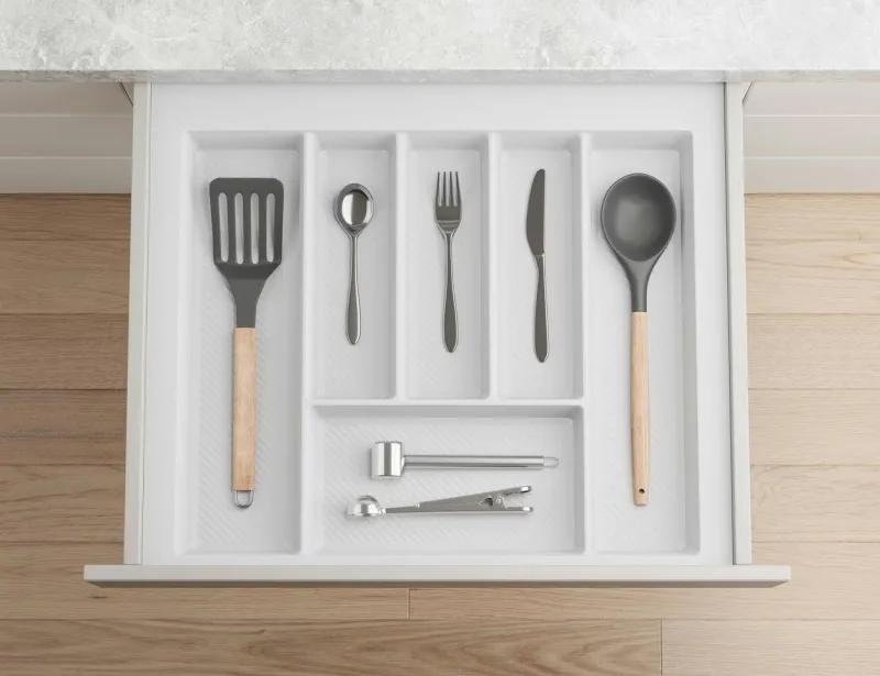 Príborníky STAR sú vyrobené z odolného plastu s jemnou štruktúrou, čo z nich robí elegantný doplnok vašej kuchyne. Vďaka dostatočne širokým okrajom pohodlne vyplníte každú zásuvku. Stačí si zmerať vnútorný rozmer zásuvky a okraje odrezať podľa vašich preferencií.