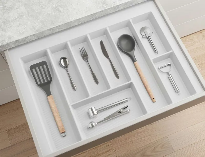 Príborníky STAR sú vyrobené z odolného plastu s jemnou štruktúrou, čo z nich robí elegantný doplnok vašej kuchyne. Vďaka dostatočne širokým okrajom pohodlne vyplníte každú zásuvku. Stačí si zmerať vnútorný rozmer zásuvky a okraje odrezať podľa vašich preferencií.