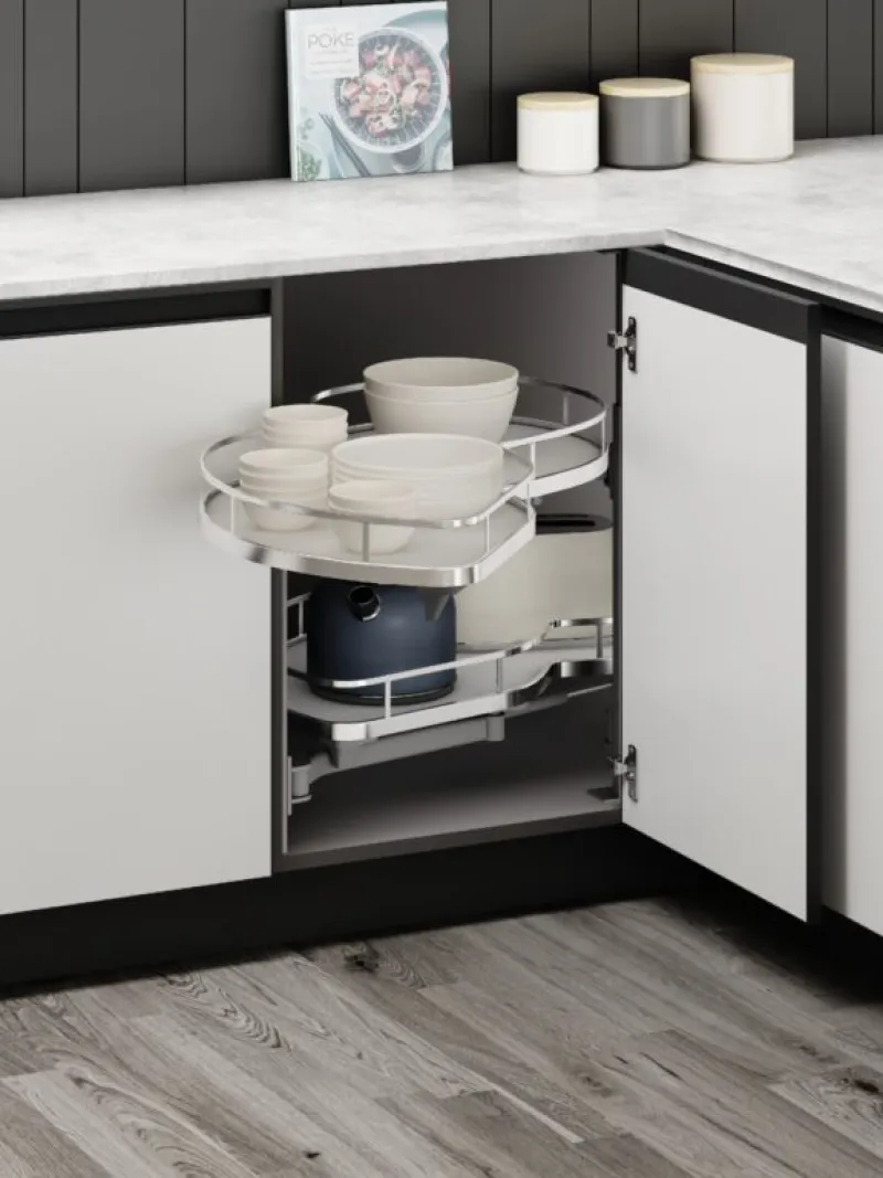 Rohová výsuvná polica do slepého rohu s výsuvom doľava. Elegantné a priestorovo úsporné riešenie pre rohové kuchynské skrinky prináša značka WIRELI v rámci dizajnovej série Elegance. Tento výsuvný systém umožňuje jednoduché a pohodlné využitie inak ťažko prístupného priestoru v rohovej skrinke – vďaka plynulému výsuvu dvoch asymetricky tvarovaných políc smerom doľava.