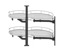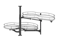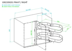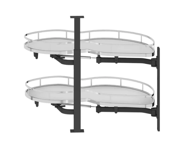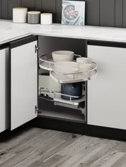 Rohová výsuvná polica do slepého rohu s výsuvom doprava. Elegantné a priestorovo úsporné riešenie pre rohové kuchynské skrinky prináša značka WIRELI v rámci dizajnovej série Elegance. Tento výsuvný systém umožňuje jednoduché a pohodlné využitie inak ťažko prístupného priestoru v rohovej skrinke – vďaka plynulému výsuvu dvoch asymetricky tvarovaných políc smerom doprava.