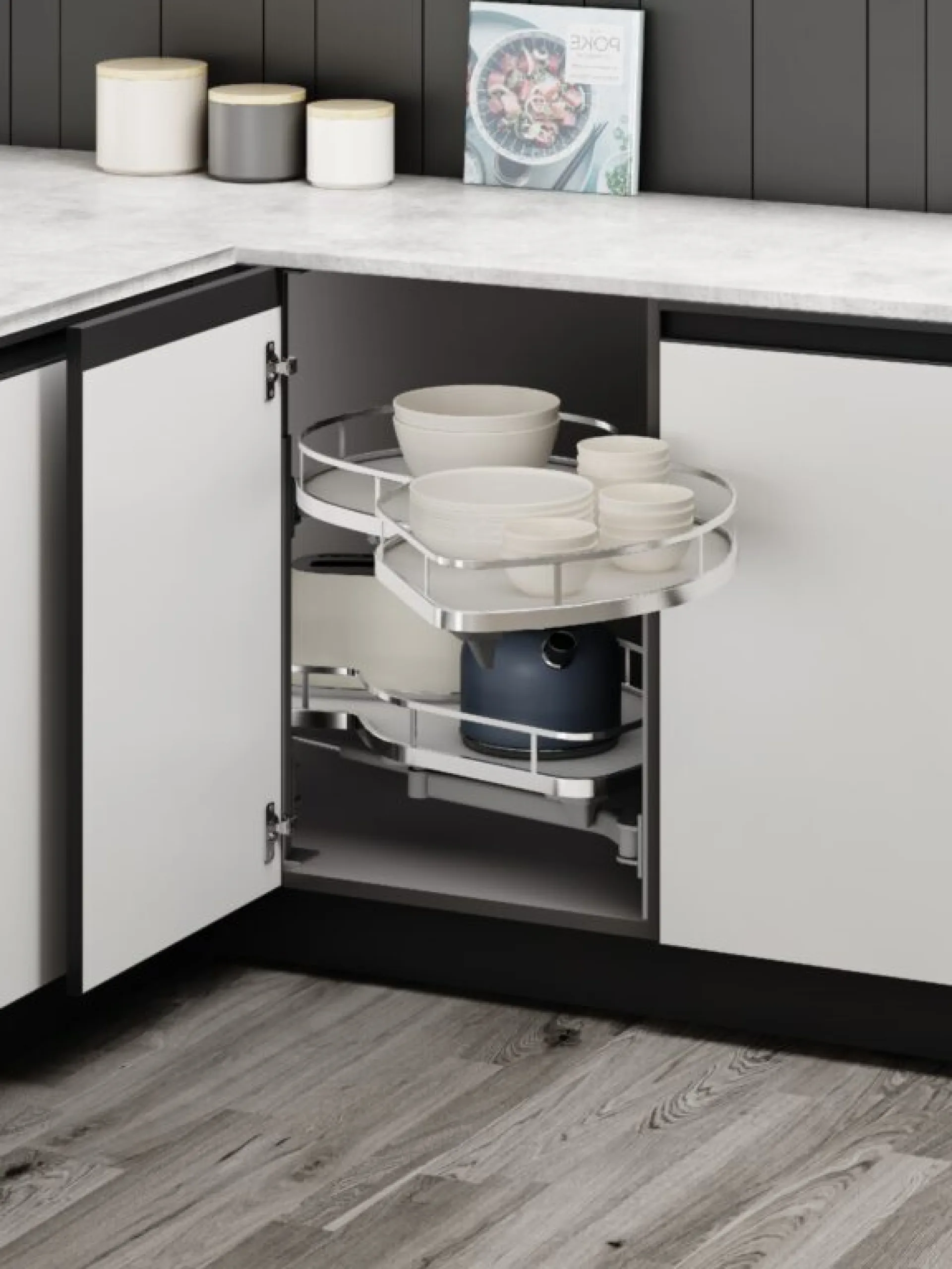Výsuvná polica do slepého rohu zo série Elegance je inteligentným a esteticky prepracovaným riešením, ktoré výrazne zvyšuje komfort aj funkčnosť vašej kuchyne. S WIRELI Elegance získavate premyslený systém, ktorý maximálne využíva každý centimeter priestoru – bez kompromisov medzi vzhľadom a praktickosťou.
