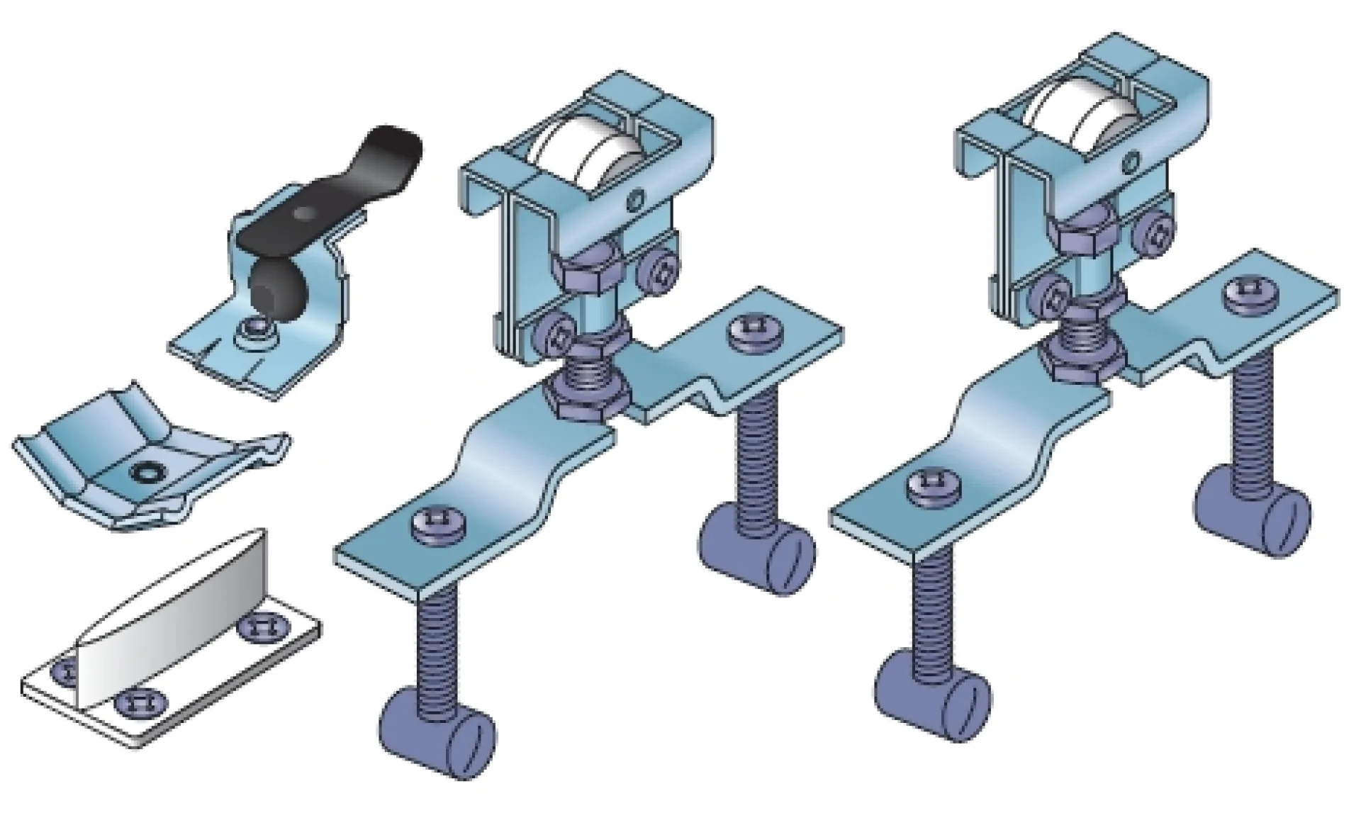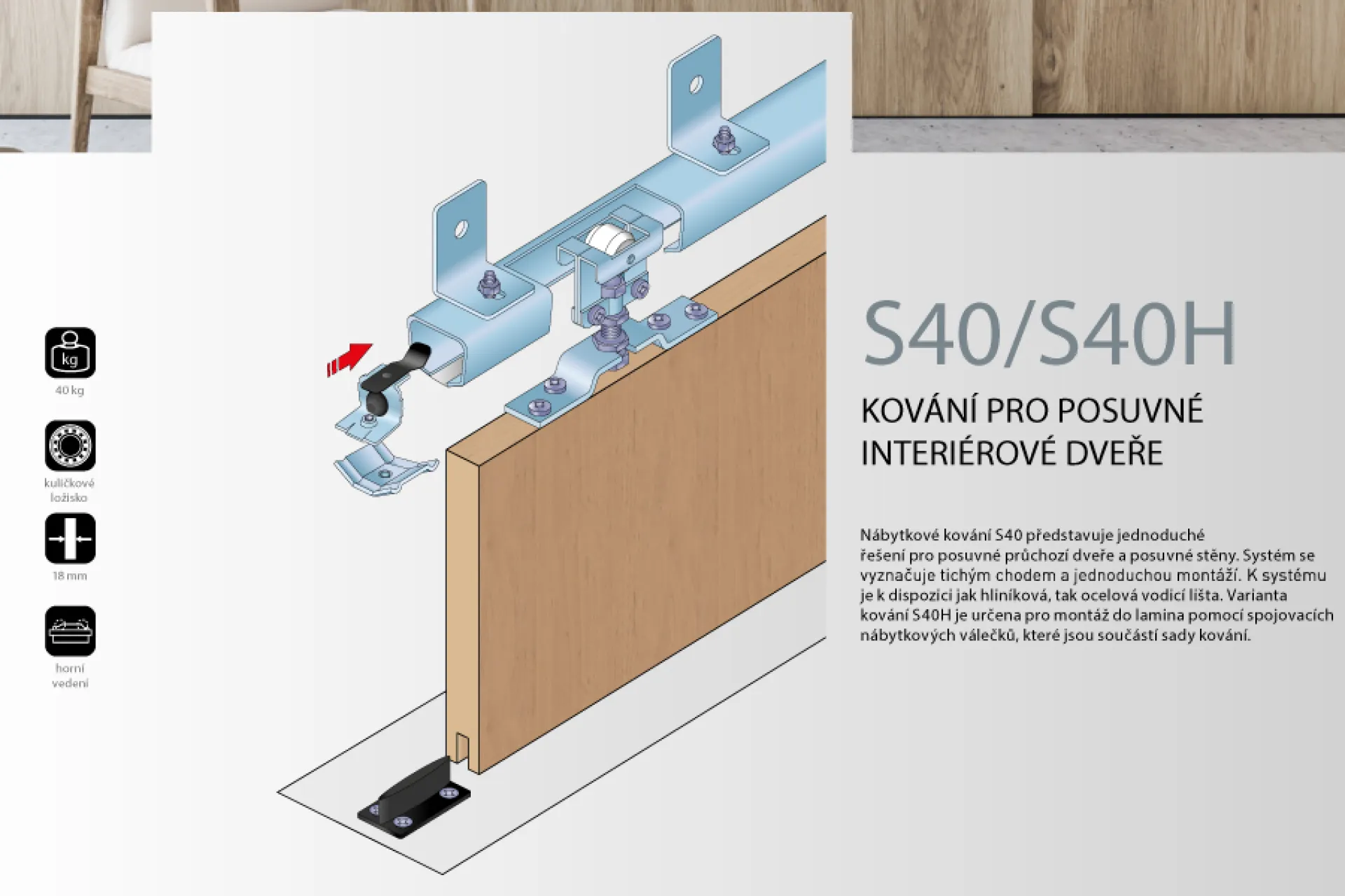 Sada vozíkov na interiérové posuvné dvere. Nosnosť 40kg. Vhodné k vodiacemu profilu S80N. Varianta vozíkov na montáž do dverí pomocou spojovacích nábytkových valčekov.