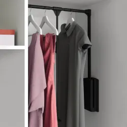 Sklopná šatníková tyč umožňuje jednoduchý prístup do horných častí skrine. Šírka tyče je nastaviteľná, aby sa prispôsobila úžitkovému priestoru šatníkovej skrine. Tyč má tlmiaci mechanizmus s tichým dovieraním a maximálnu nosnosť 12 kg. Pri inštalácii do šatníkovej skrine s klasickými dverami na pántoch odporúčame montáž spolu s dištančnou podložkou (pozri súvisiaci tovar).