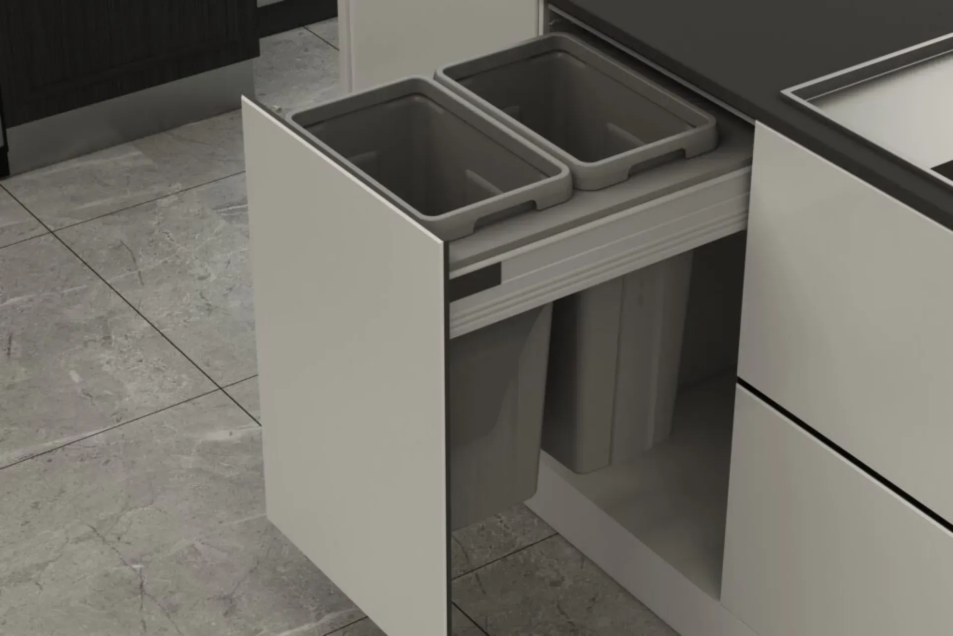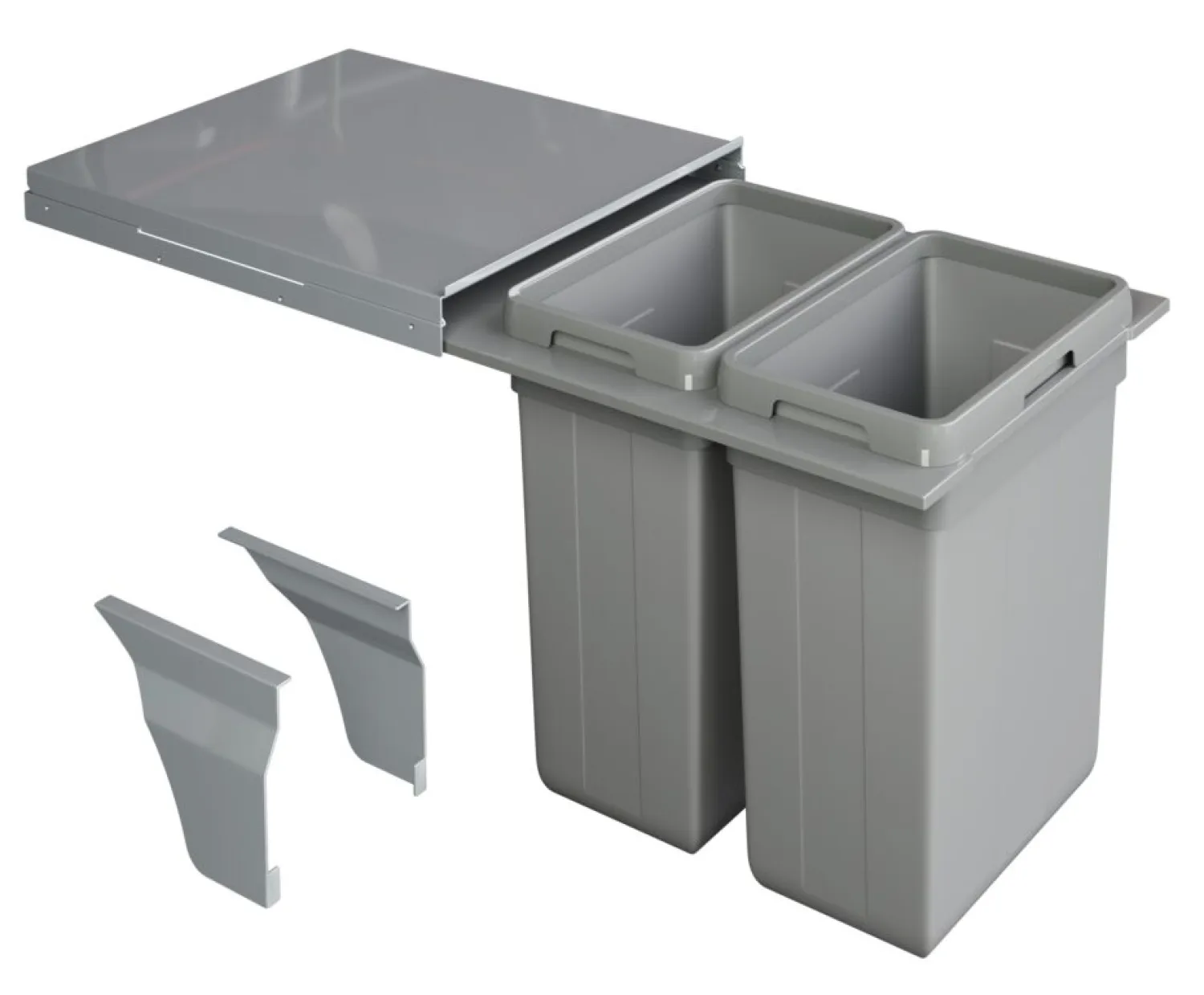 Systém má dve 27-litrové nádoby a je vybavený pevným oceľovým vekom, ktoré okrem zakrytia košov slúži aj ako polica vo vnútri korpusu na uloženie ľahkého príslušenstva.