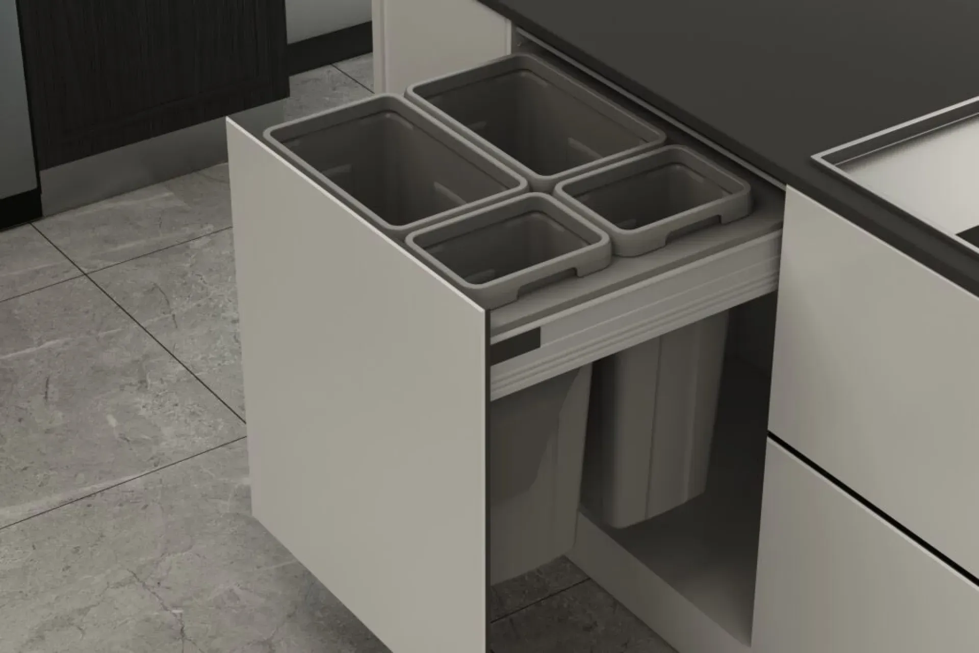 Plastový odpadkový 4-kôš Elegance na separáciu a triedenie domáceho odpadu do korpusu 600 mm so zásuvkou Blum TANDEMBOX antaro.