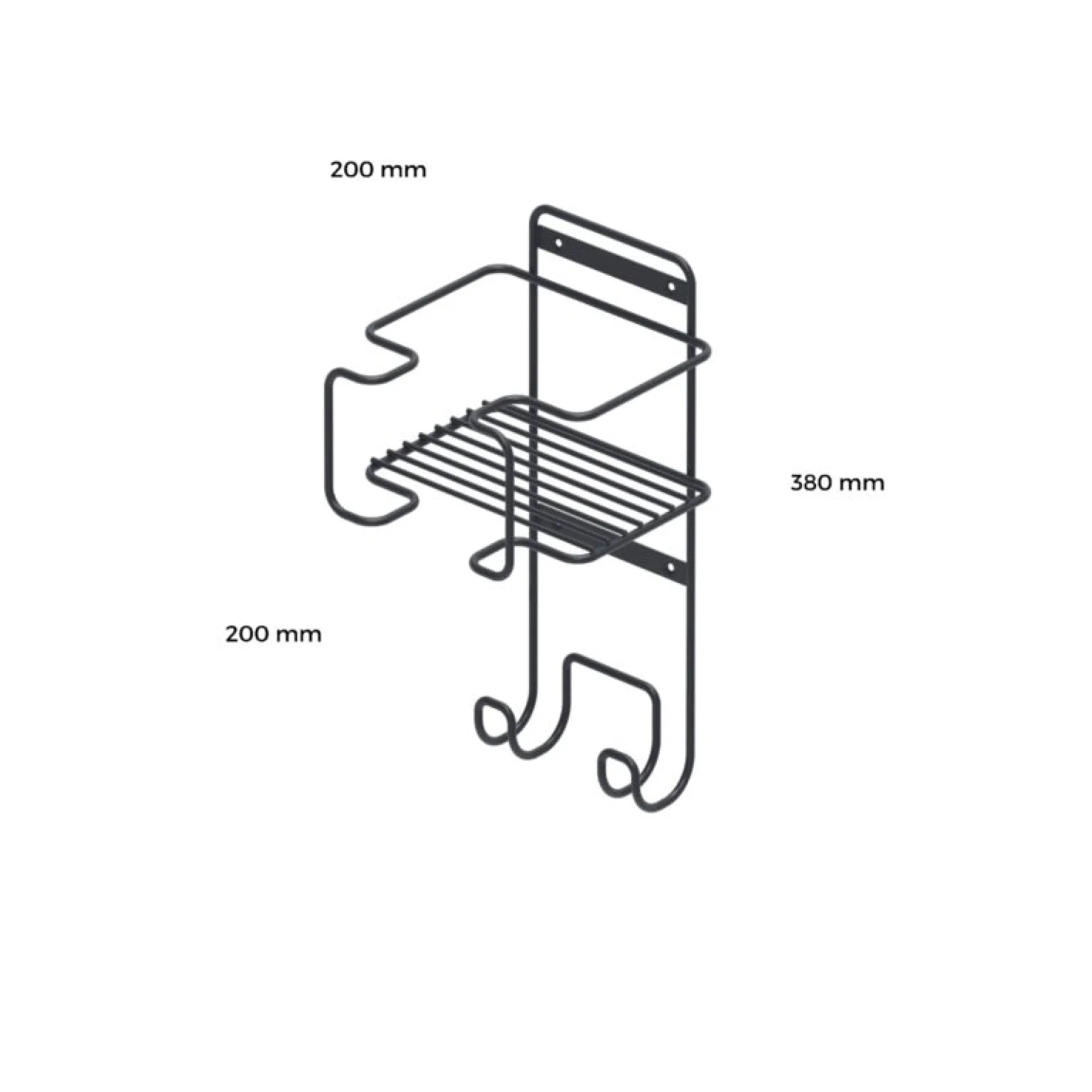 Organizérový stojan má košík na umiestnenie žehličky a háčiky na upevnenie žehliacej dosky, aby sa zabránilo jej pohybu.