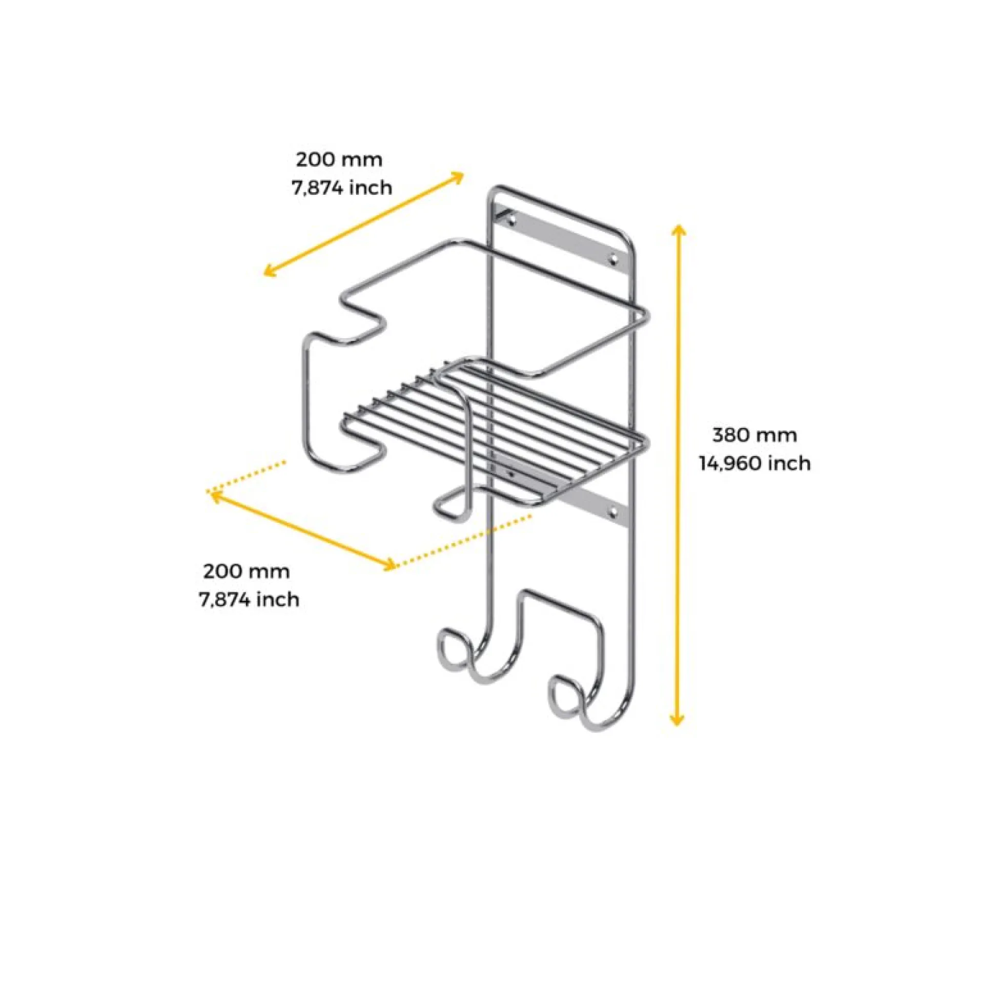 Organizérový stojan má košík na umiestnenie žehličky a háčiky na upevnenie žehliacej dosky, aby sa zabránilo jej pohybu.