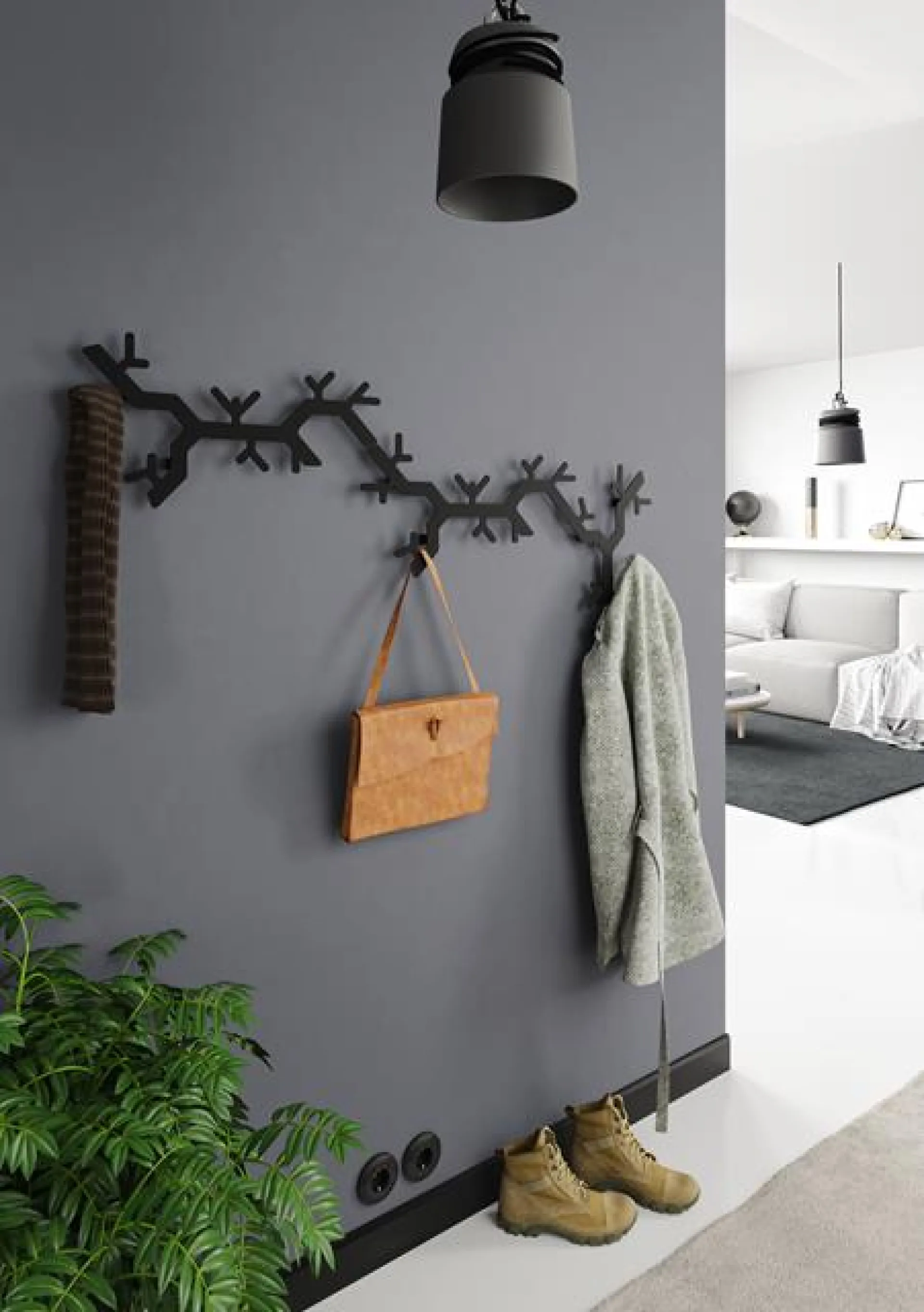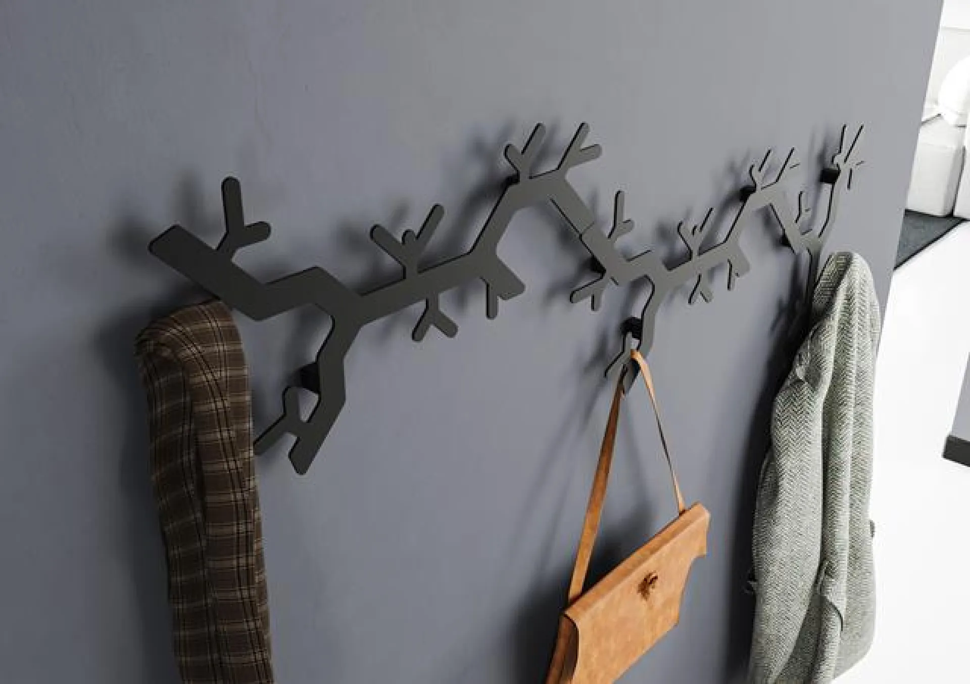 Moderný združený kovový vešiak čiernej farby.