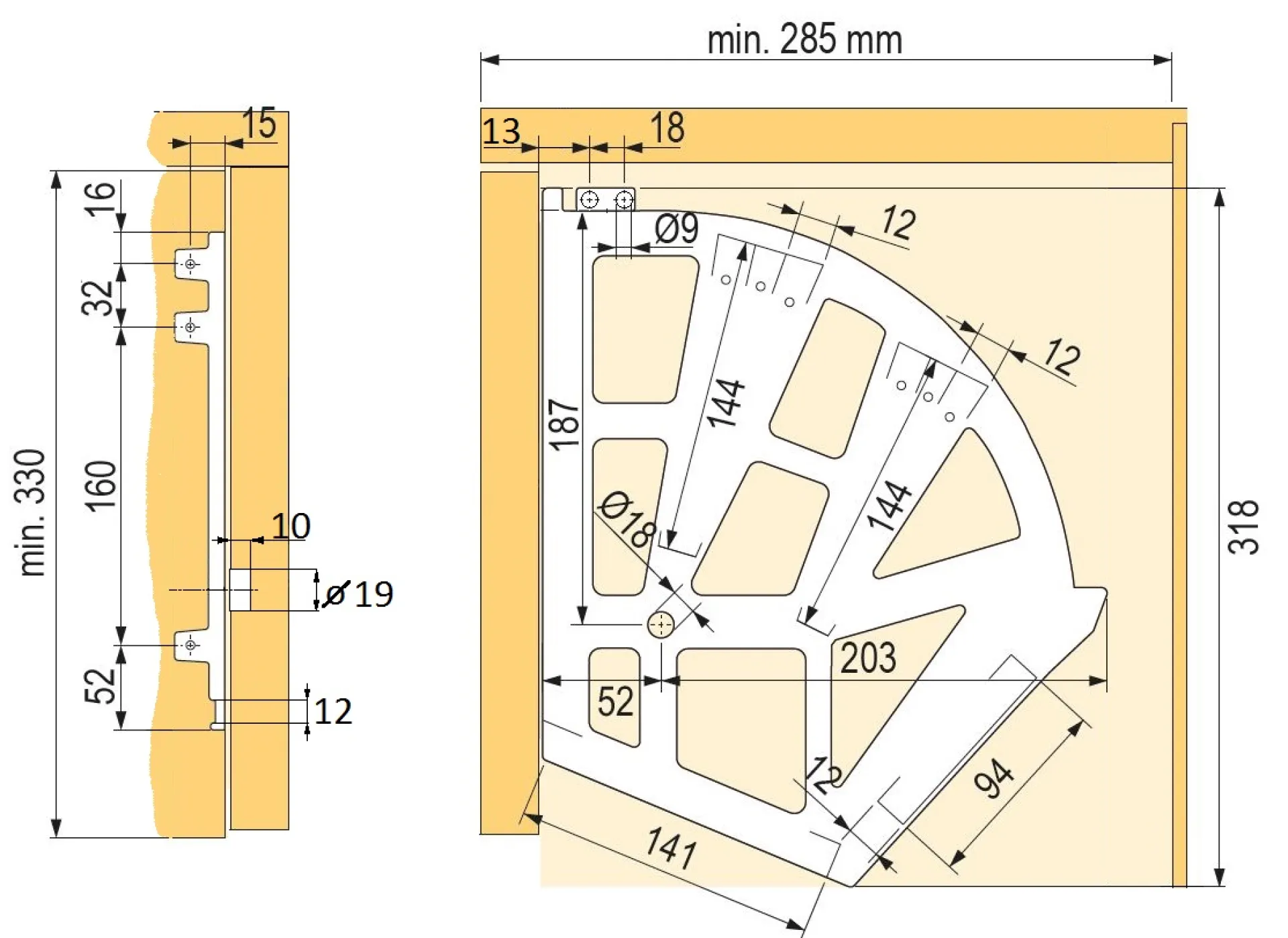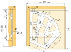 Botníkový výklop pre tri police na topánky. Rozmer polic na topánky: hrúbka 12mm, výška 144/144/94mm, šírka podľa svetlej šírky korpusu (LW - 8mm).