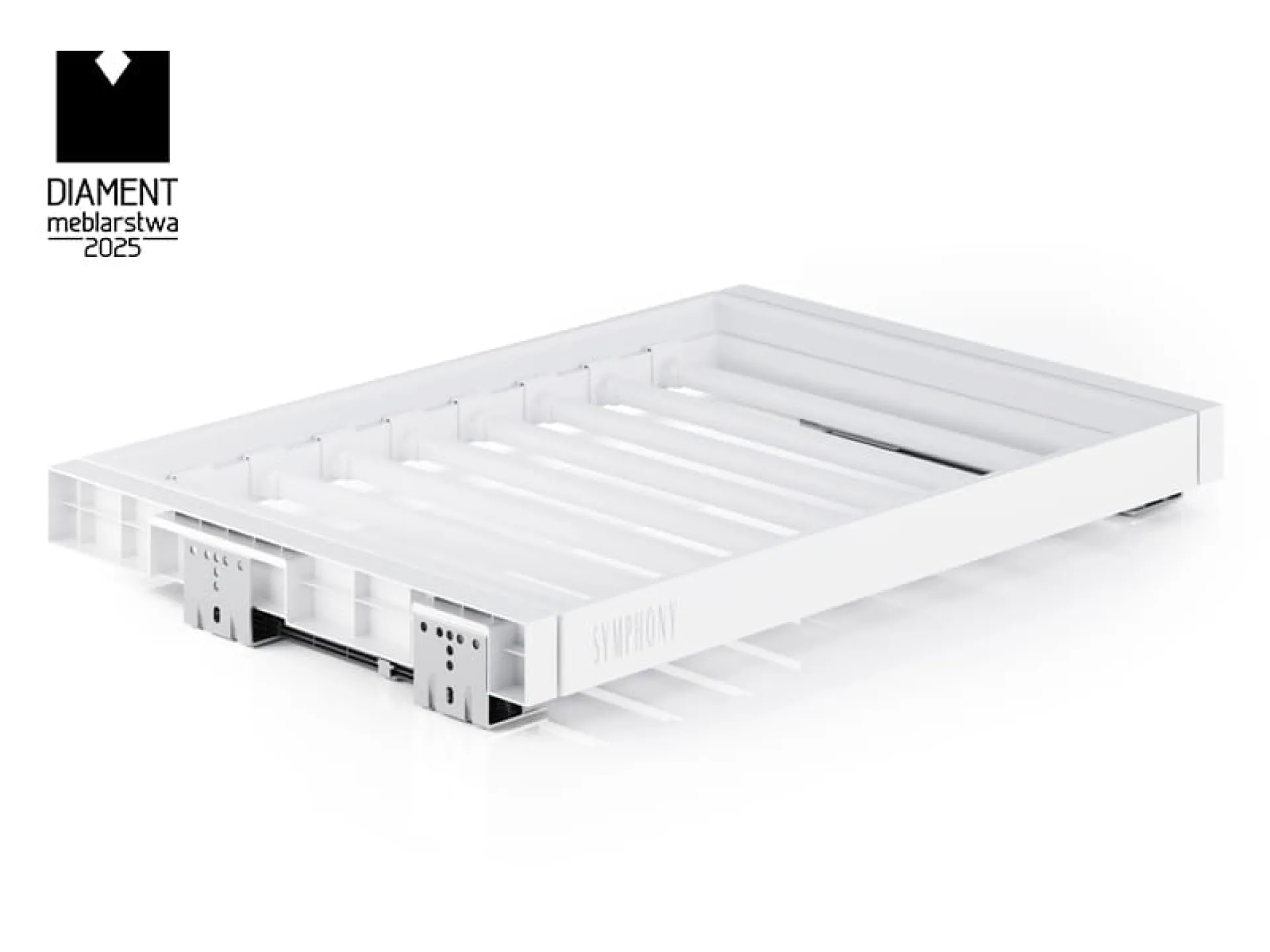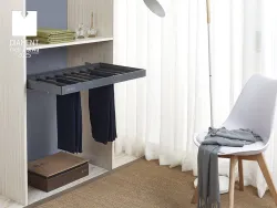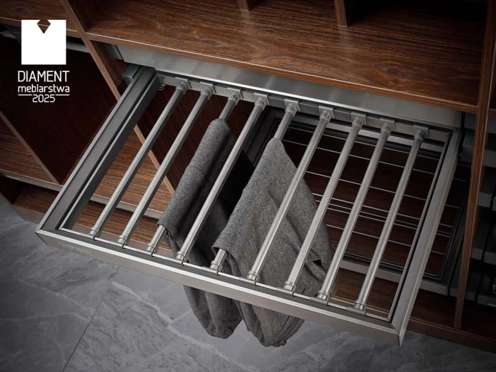 Vešiak na nohavice zo série SYMPHONY je vybavený systémom plného výsuvu, ktorý umožňuje jeho úplné vysunutie. Získate tak jednoduchý prístup ku všetkým uloženým veciam, aj k tým umiestneným vzadu. Systém plného výsuvu zabezpečuje plynulý a stabilný chod, čo výrazne zvyšuje komfort používania aj organizáciu priestoru.