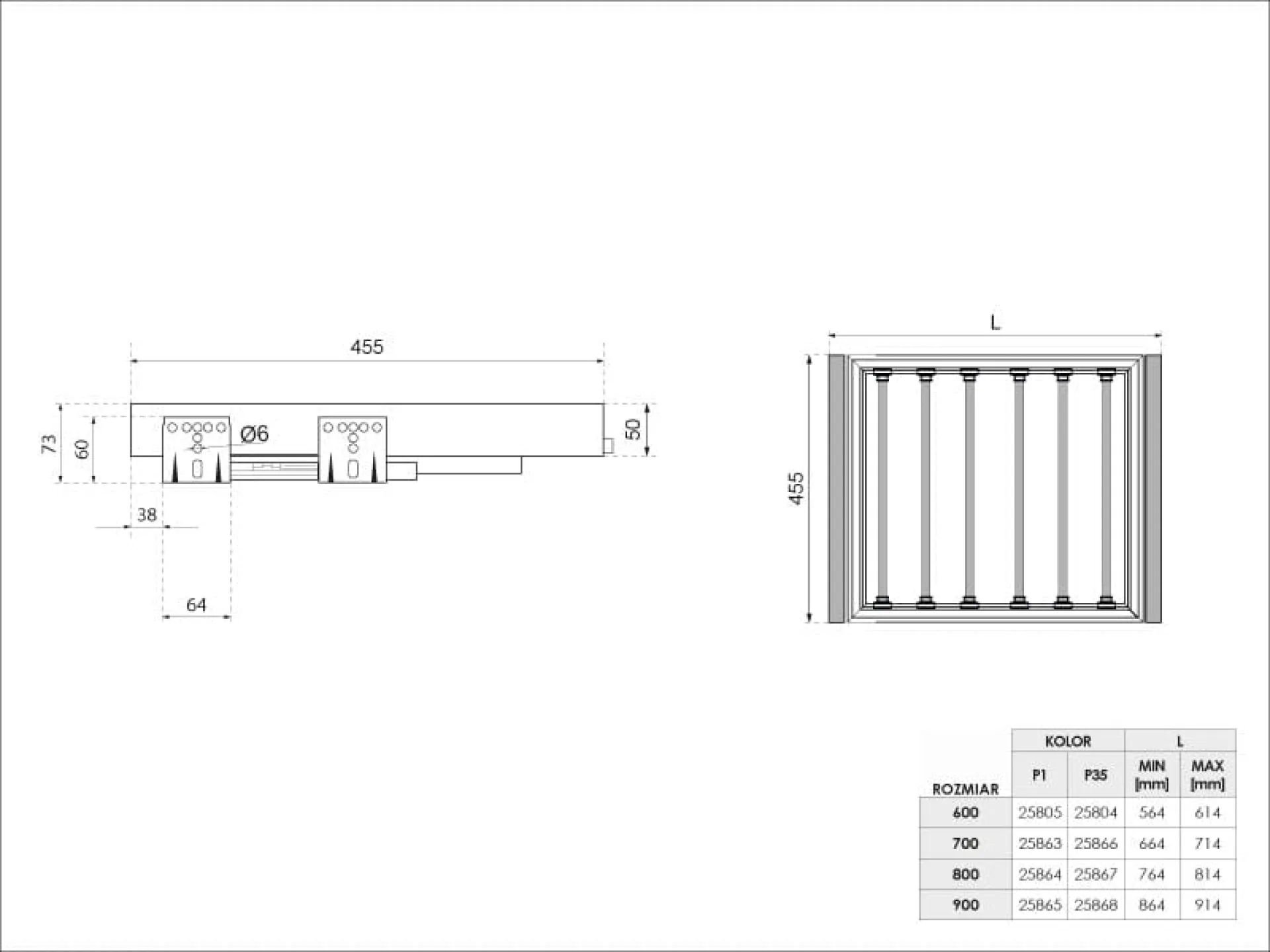 Vešiak WB-662 má nastaviteľnú šírku v rozmedzí 5 cm, čo umožňuje jeho presné prispôsobenie rôznym šírkam skríň. Nastavenie je rovnomerne rozložené – vešiak možno rozšíriť o 2,5 cm na každej strane. Univerzálny úchyt umožňuje rýchlu výmenu a môže byť nahradený inými doplnkami zo série SYMPHONY.