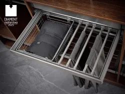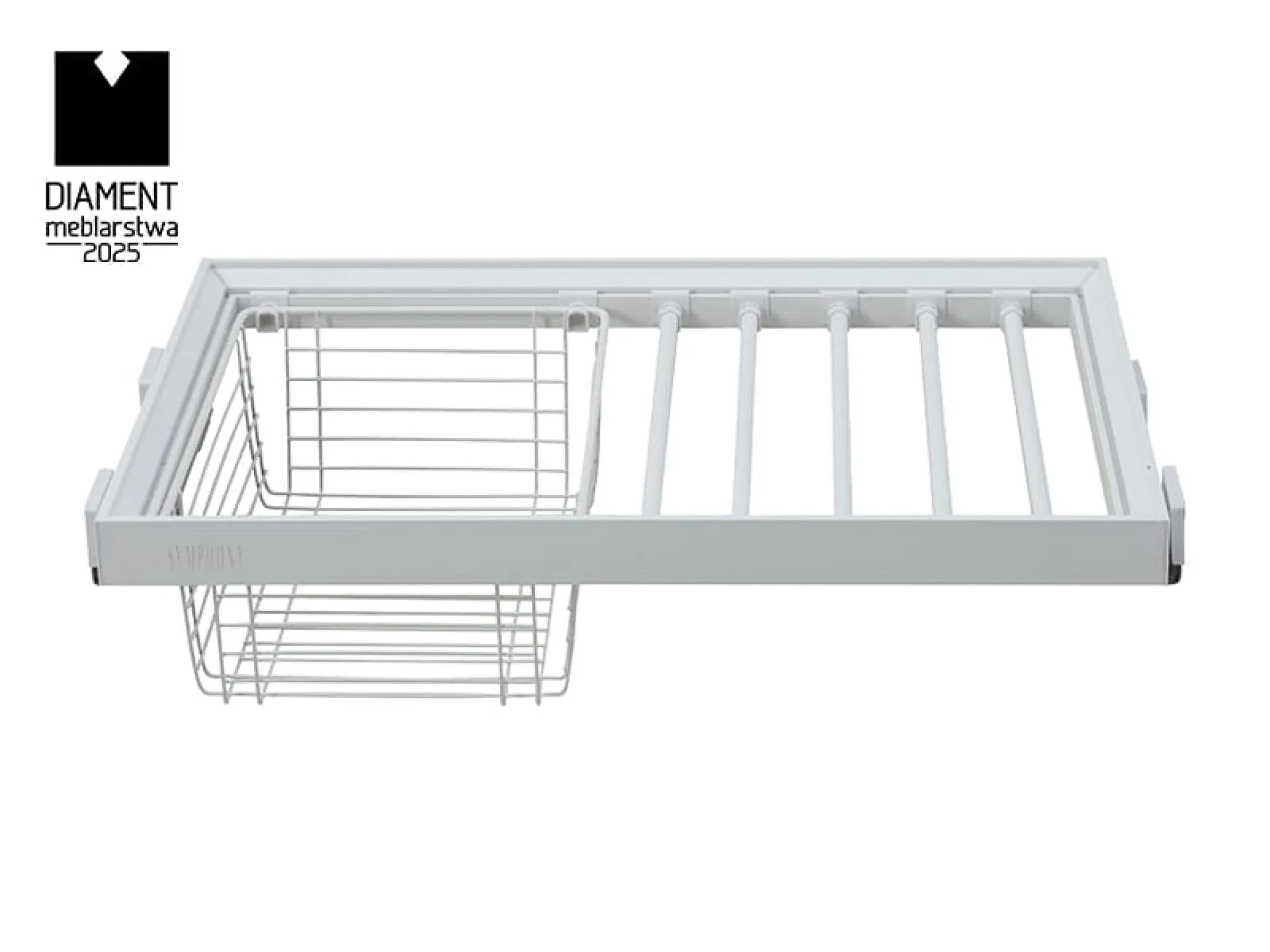 Vešiak na nohavice spolu s košom WB-663 je vynikajúcim hybridným riešením na uloženie nohavíc na vešiaku a oblečenia či bielizne v koši. Vyznačuje sa minimalistickým dizajnom a elegantnou konštrukciou, vďaka čomu dokonale zapadne do každého moderného interiéru a dodá mu luxusný a svieži vzhľad. Spodné vedenie (s neviditeľným uchytením) zabezpečí, že vnútro šatníka bude pôsobiť mimoriadne esteticky.