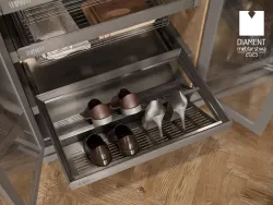 Kôš na topánky zo série SYMPHONY ponúka pôsobivú maximálnu nosnosť do 35 kg, čo zabezpečuje bezpečné uloženie obuvi bez obáv o stabilitu konštrukcie. Testy pojazdového systému na úrovni 60 000 cyklov garantujú dlhú životnosť aj pri intenzívnom používaní.
