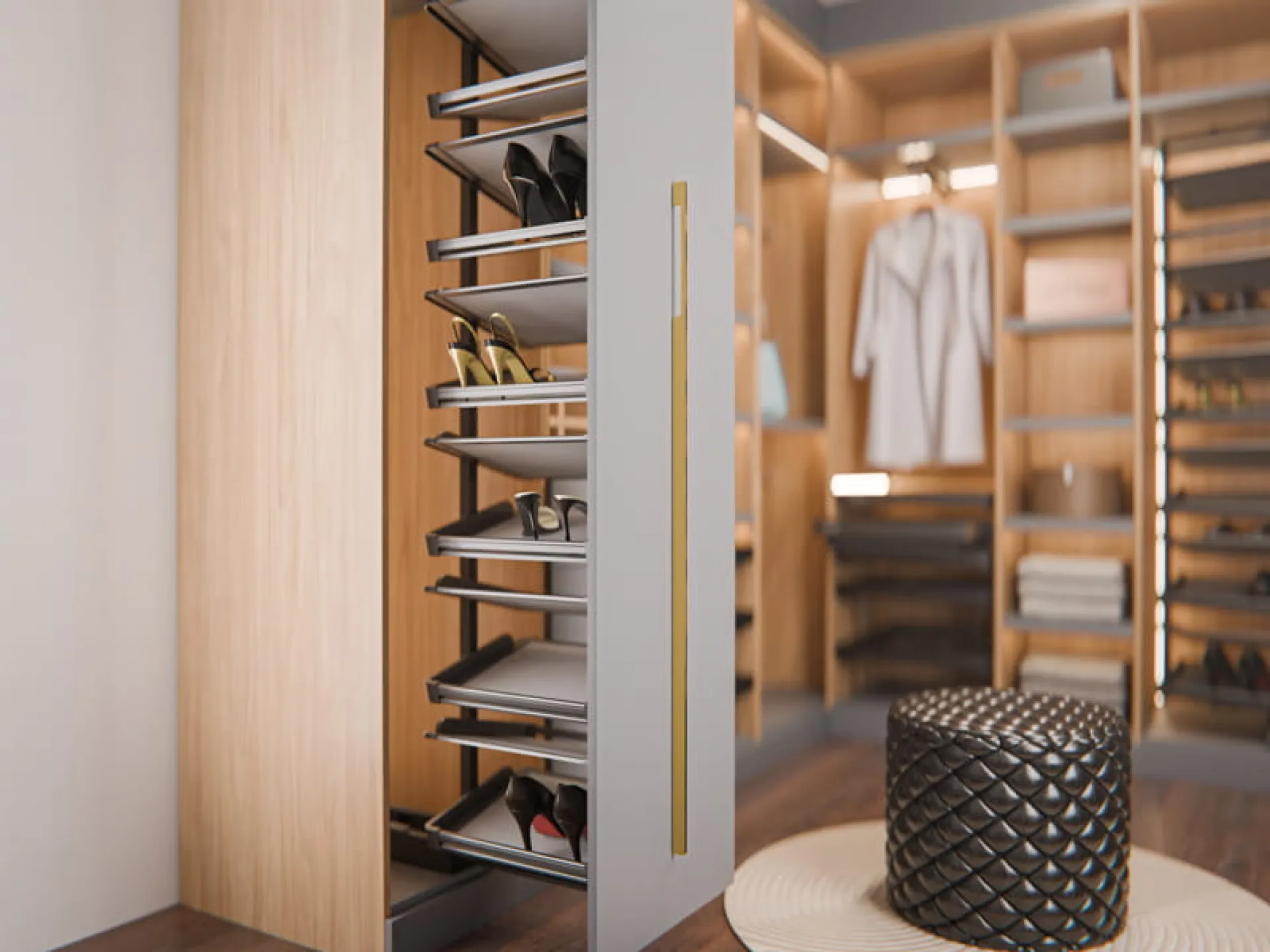 Poličky uložené pod uhlom zaručujú výbornú prehľadnosť a jednoduchý prístup k topánkam. Každý pár má svoje miesto a ochranné prvky zabraňujú ich náhodnému vypadnutiu. Ide o riešenie, ktoré uľahčuje každodenné používanie a udržiavanie poriadku.