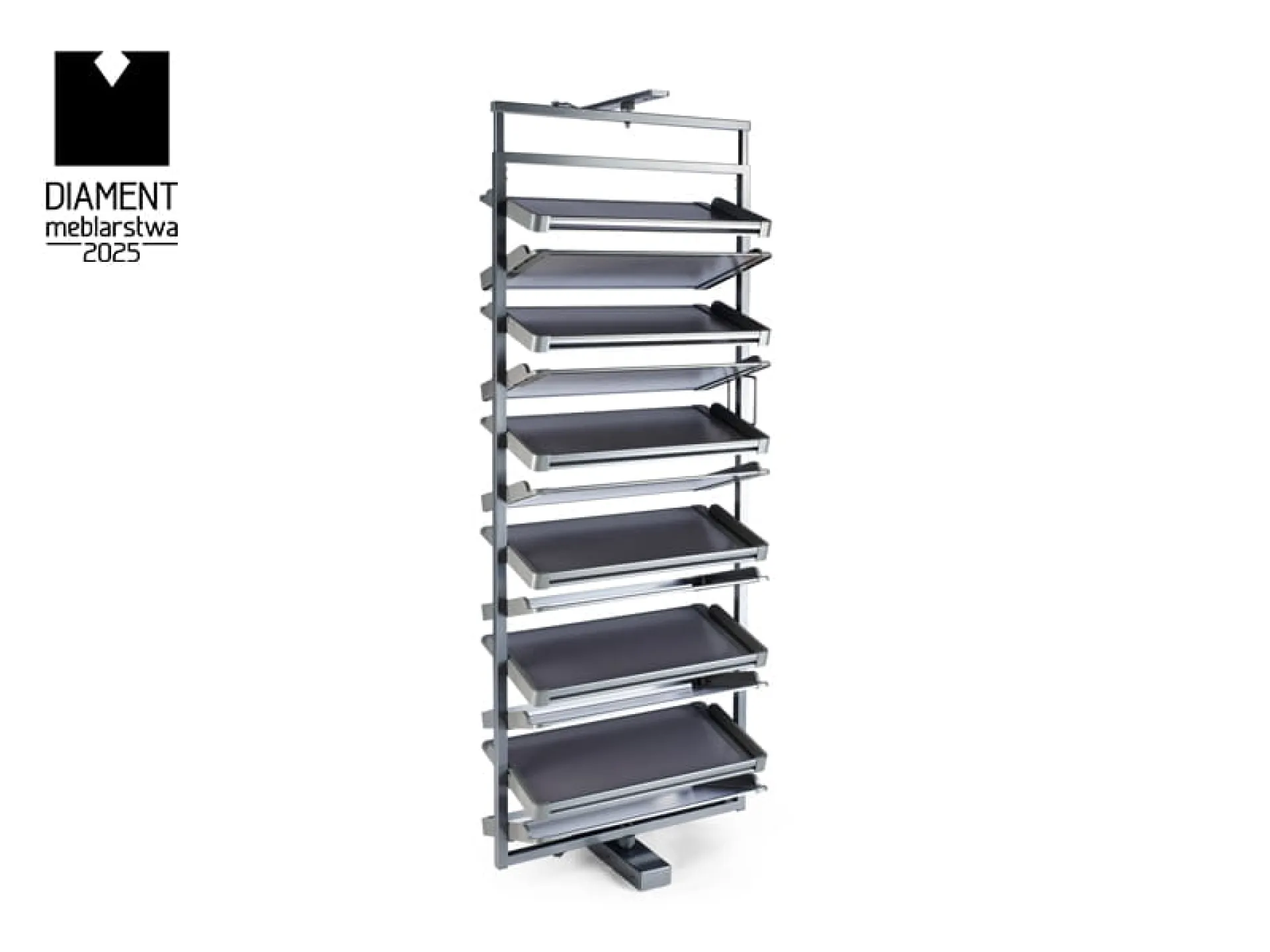 Plné otočenie koša o 360° uľahčuje prístup ku každej polici. Nemusíte siahať hlboko do vnútra skrine – stačí otočiť policu a okamžite máte prístup ku každej páre topánok. Organizácia a výber vhodnej obuvi nikdy nebol jednoduchší!